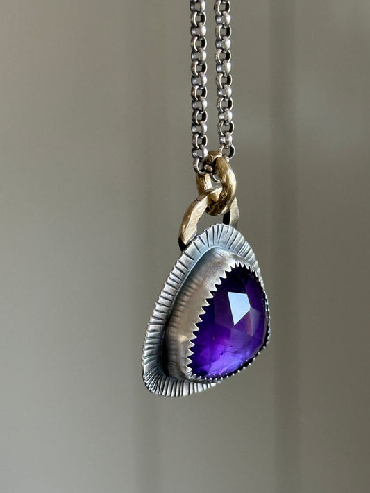 Very pretty amethyst stone. Colour is highlighted by the oxidised silver. Well made. I love it.