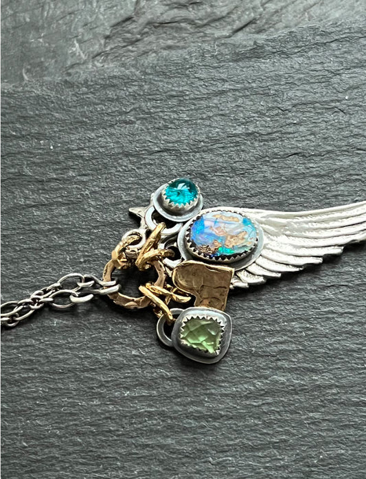 Angel wing charm necklace, boulder opal, apatite and tourmaline, mixed metal jeweller gift for her