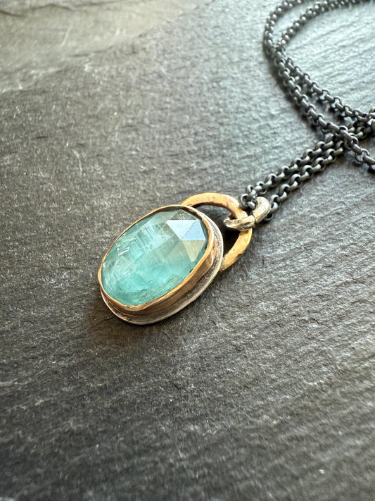 Aqua kyanite necklace, green gemstone bezel set jewellery, sterling silver mixed metal necklace