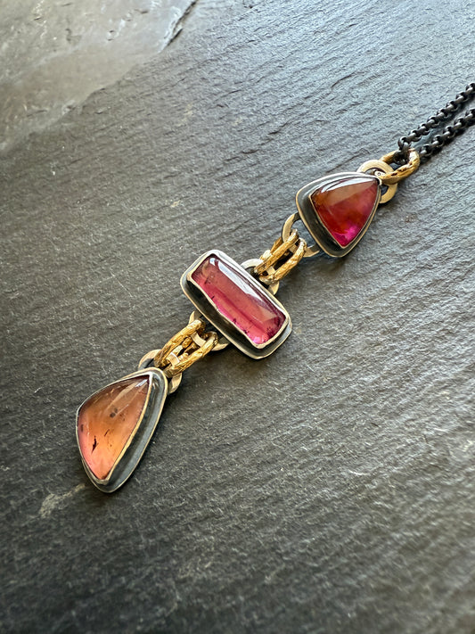 Tourmaline long charm necklace, bezel set sterling silver and mixed metal jewelry, pink and green stone necklace