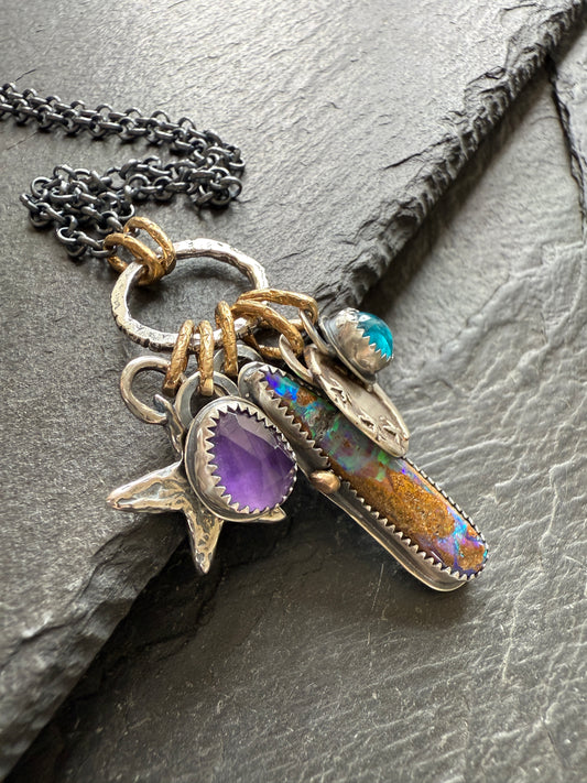 boulder opal necklace with pink tourmaline and sterling silver, opal layering necklace, December birthstone gift