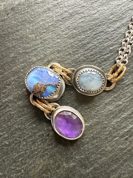Beautiful combination of colours with the Amethyst and Kyanite and with bronze gold accent links - really unusual and a joy to wear!