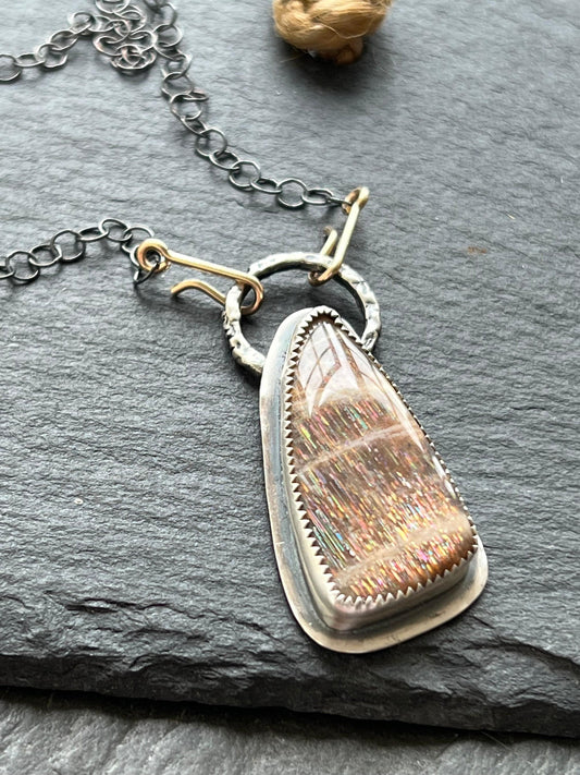 Meteor shower sunstone necklace, mixed metal jewelry, unique stone jewellery