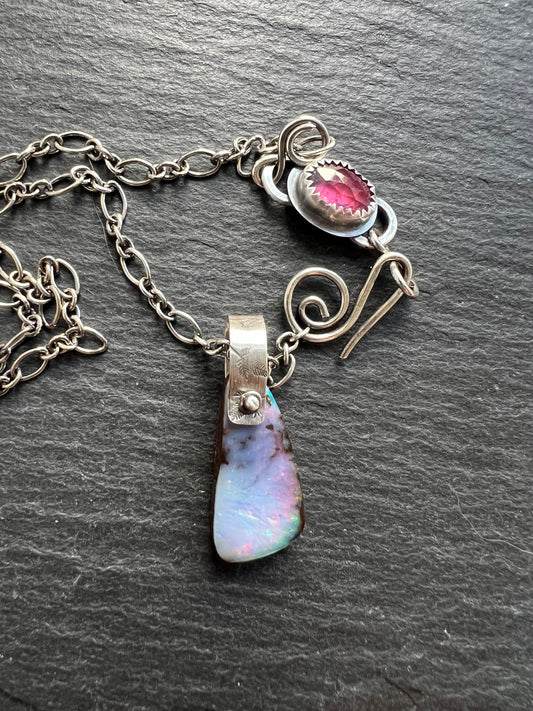 boulder opal necklace with pink tourmaline and sterling silver, opal layering necklace, December birthstone gift
