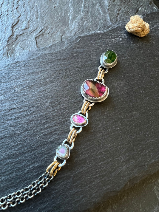Tourmaline long charm necklace, bezel set sterling silver and mixed metal jewelry, pink and green stone necklace