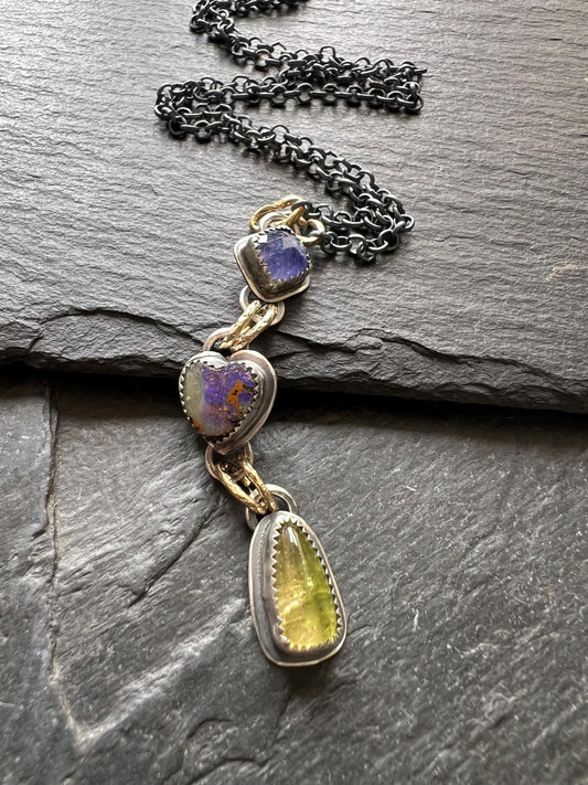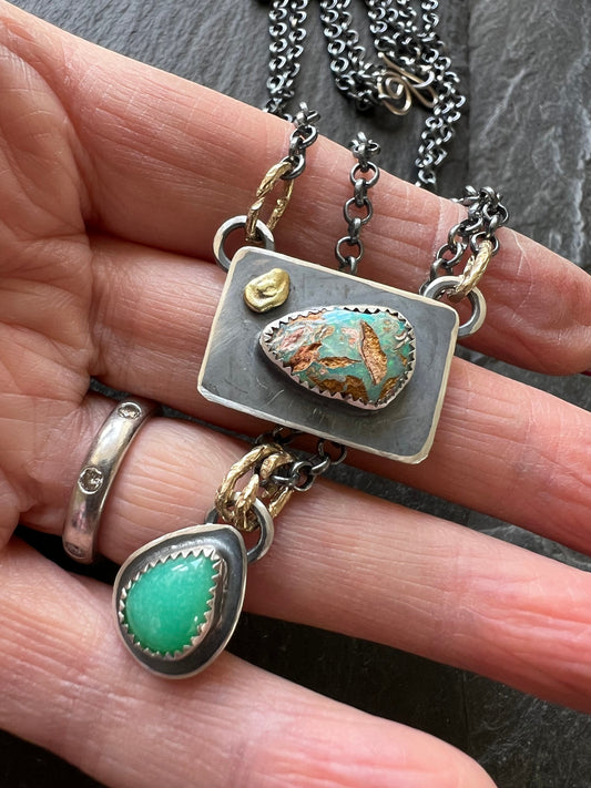 Layering opal necklace, boulder opal with a chrysoprase briolette, mixed metal necklace