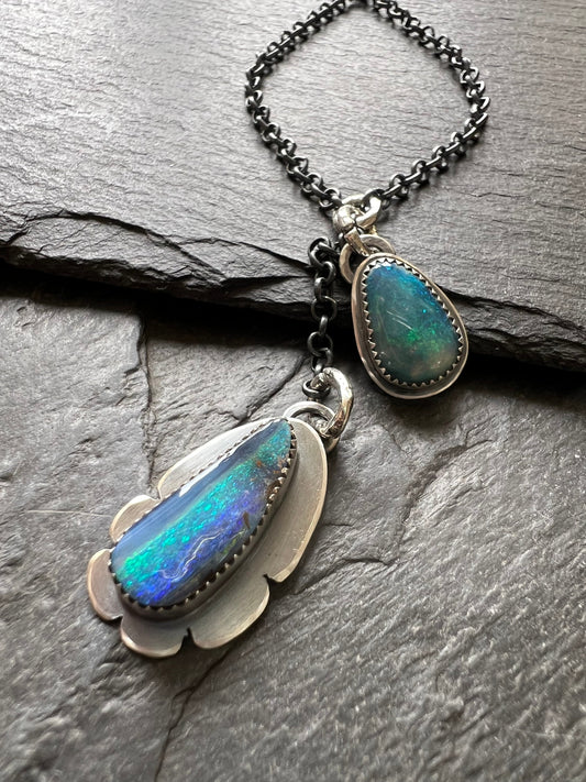 Double boulder opal lariat necklace, seascape blue colourful opal stone necklace