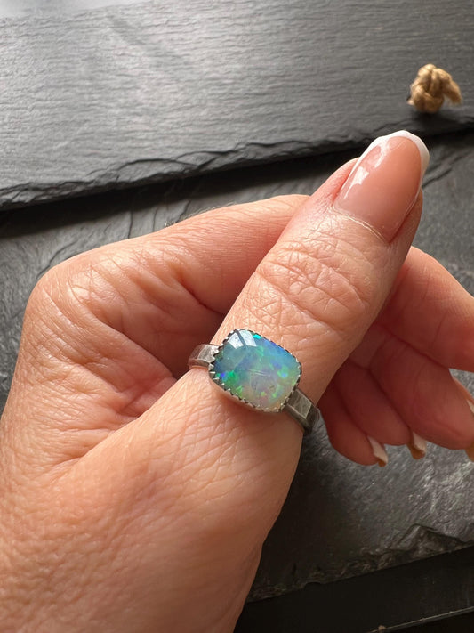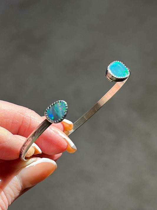 Opal open cuff bracelet, bezel set sterling silver bracelet with colourful opal doublet gemstones
