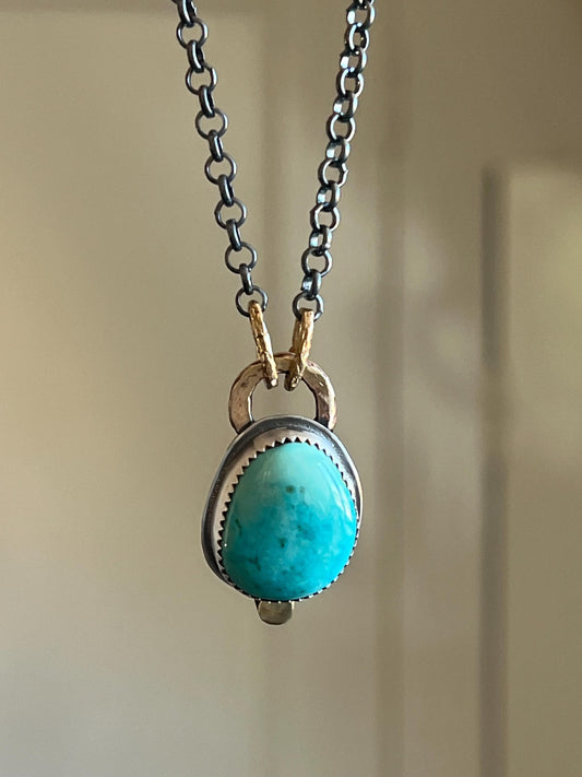 Mixed metal Turquoise necklace bezel set with sterling silver and gold, duck egg blue stone and oxidised jewellery