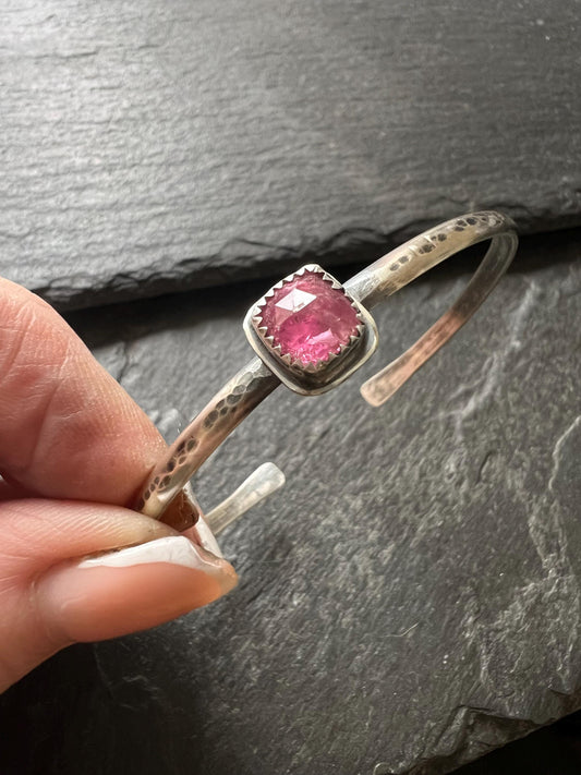Pink tourmaline sterling cuff bangle bracelet, bezel set charm silver stacking bracket, gift for her