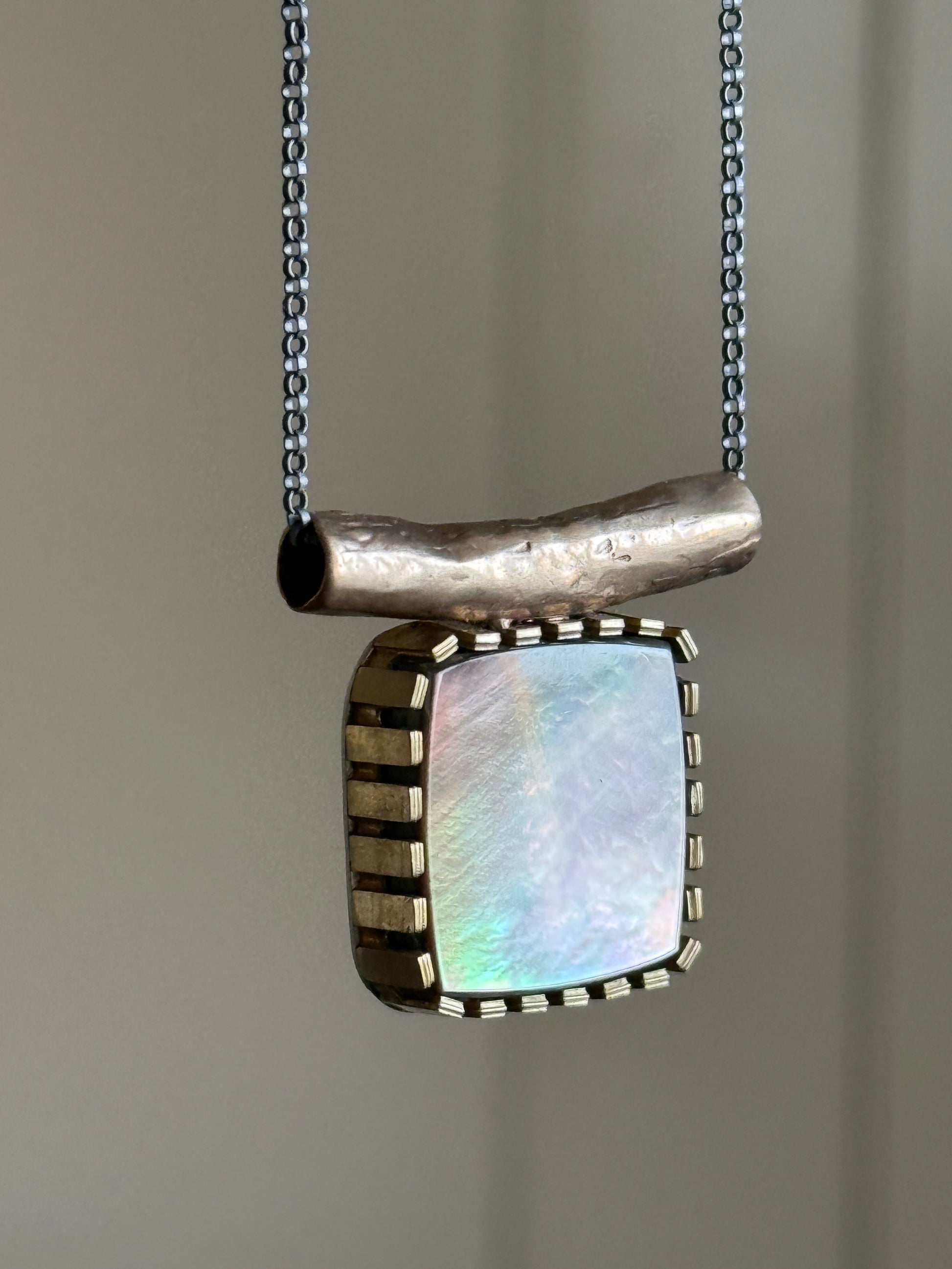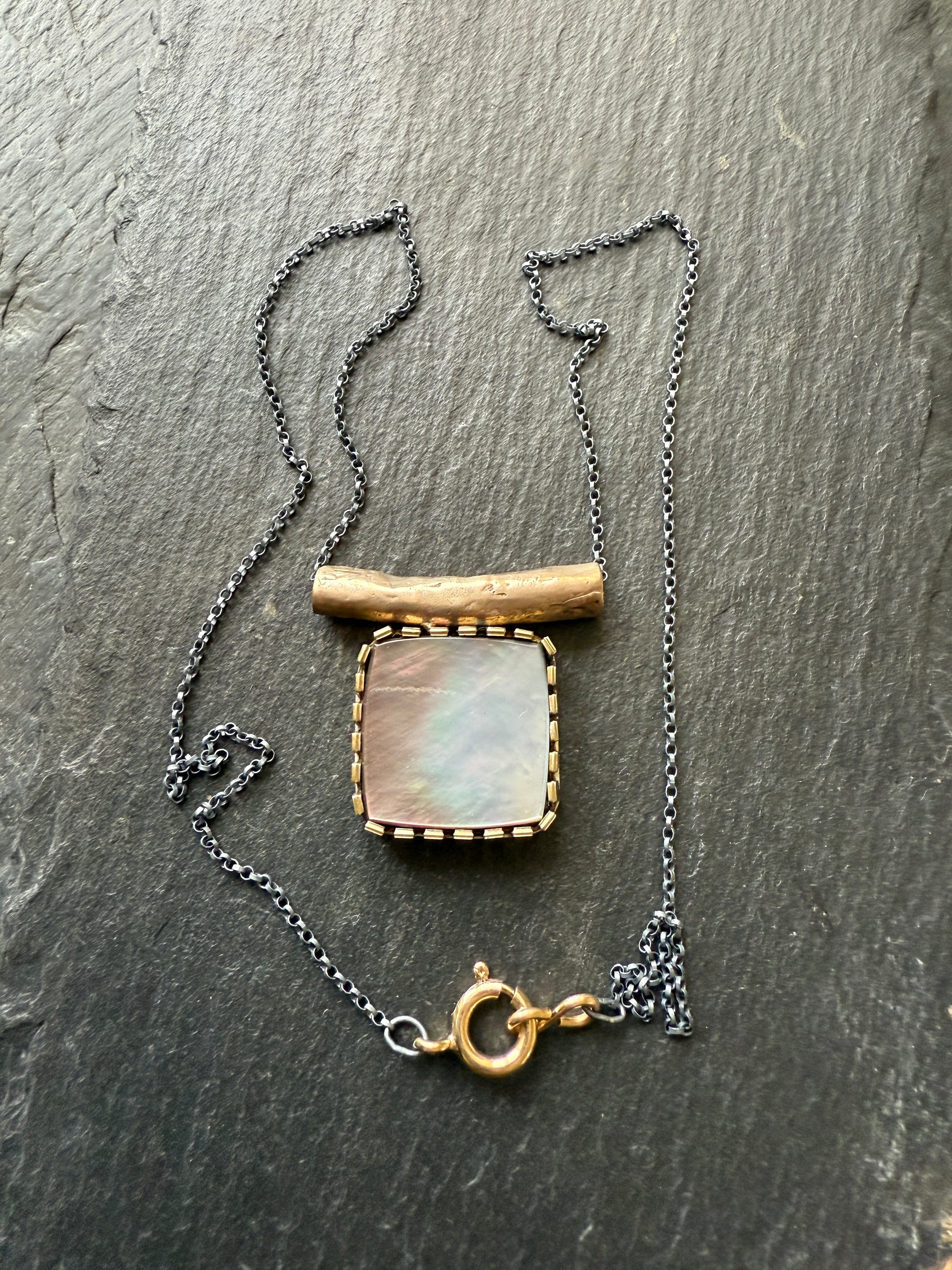 Featuring a gorgeous abalone shell which I have set in brass on sterling silver with a gold bronze bail. The chain is 18” and dark oxidised. Abalone jewellery comes in endless colour variations, making each piece perfectly unique and unable to be replicated.