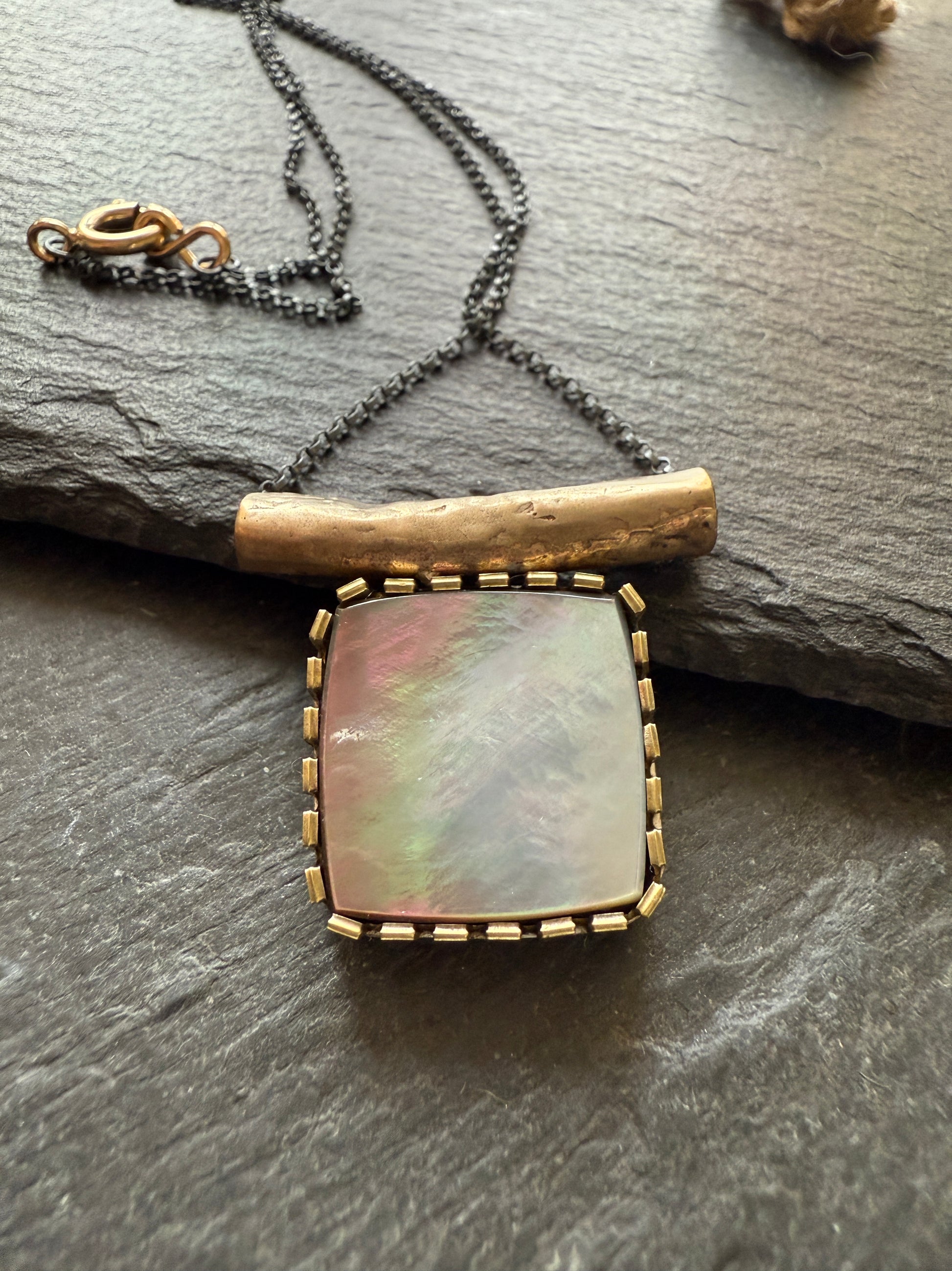 Abalone shell necklace, colourful bezel set pendant in sterling silver with mixed metals. From the sprawling ocean coasts, Mother Nature has gifted us this beautiful shell.