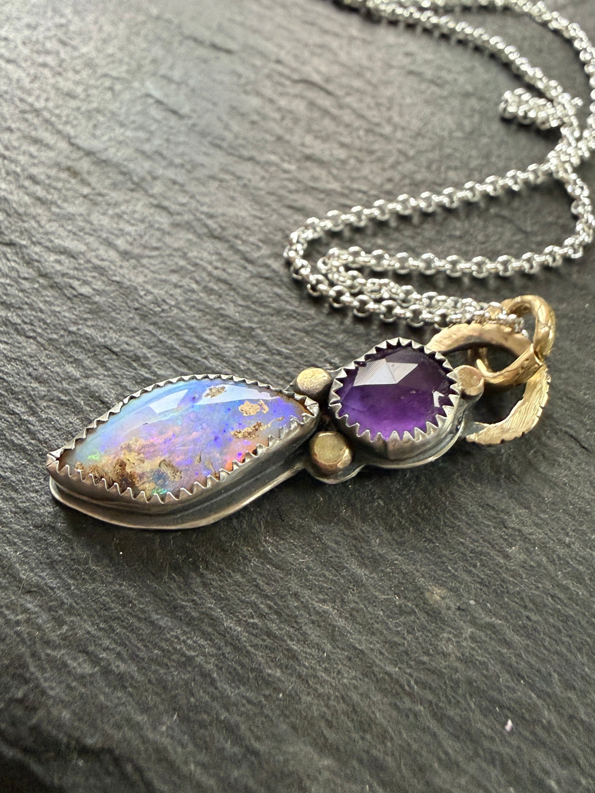 Featuring a purple amethyst and boulder opal stones set in fine and sterling silver with 18ct gold accents and a gold bronze link. The opal measures 19mm x 9mm. The pendant measures 40mm approximately. The chain is 18 inches and is a shiny silver. If you would like it oxidised just leave a message on check out.