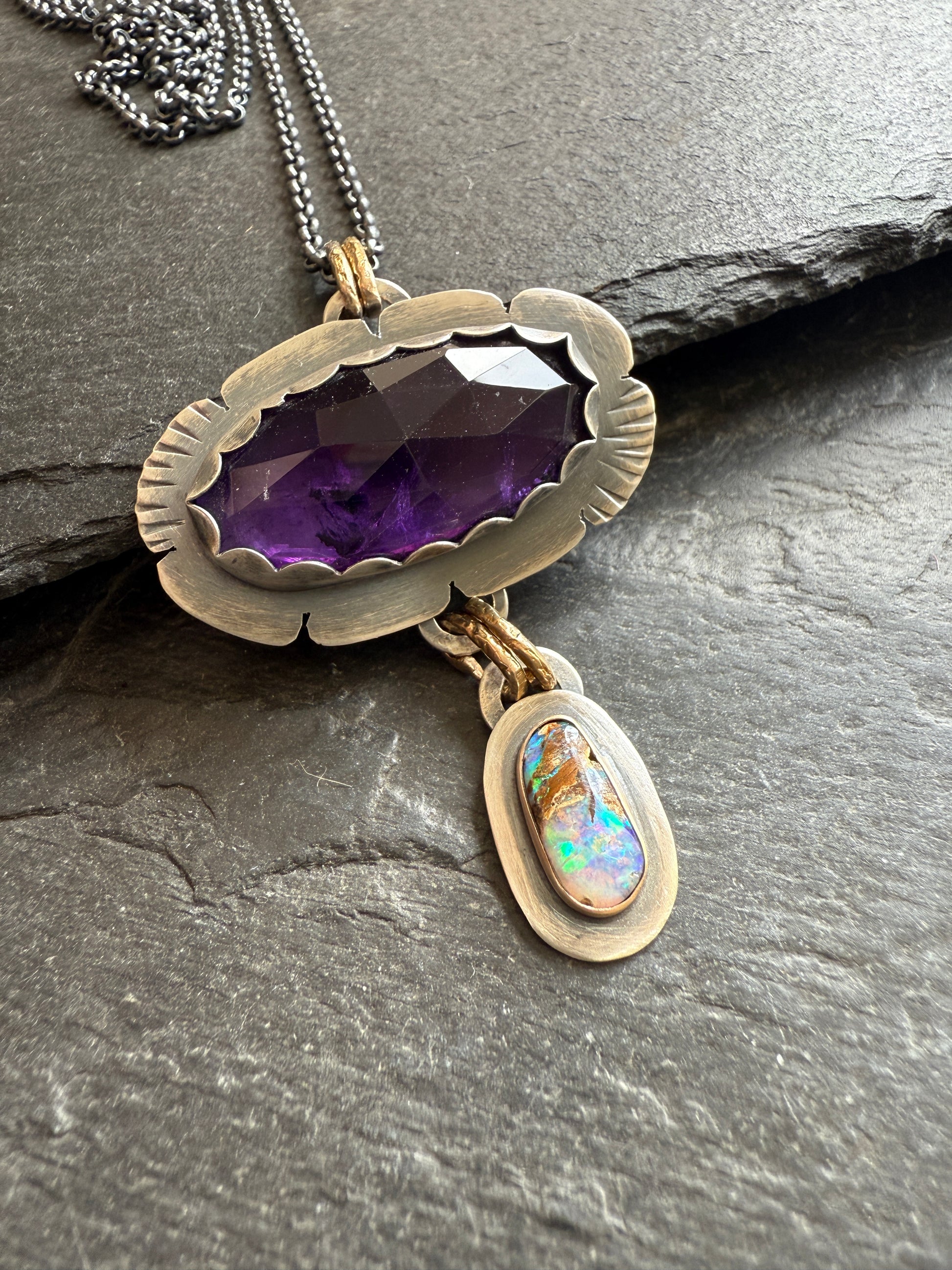Featuring a beautiful large faceted amethyst with a dainty boulder opal. February and December birthstones. These beauties are bezel set in fine and recycled sterling silver. The pendants hang from a dark oxidised silver chain with a gold bronze links. The chain is a 3mm belcher chain, 18” in length, so is great for layering with hand forged hooks.