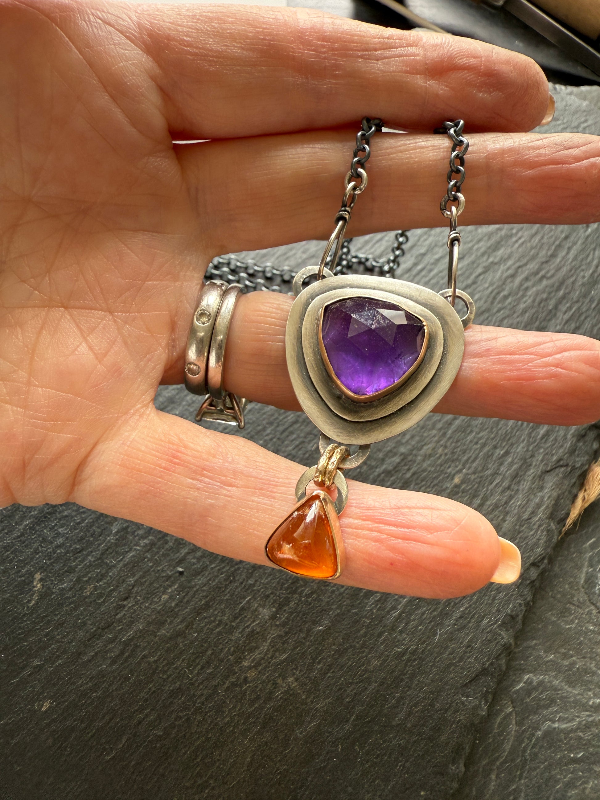 Featuring a gorgeous gemmy Amethyst and a Hessonite Garnet. The gemstones are set in 14k gold fill on sterling silver. The pendants hang from gold bronze links and an 18” dark oxidised sterling chain and hand forged sterling hooks. The amethyst measures 15mm (excluding the setting).