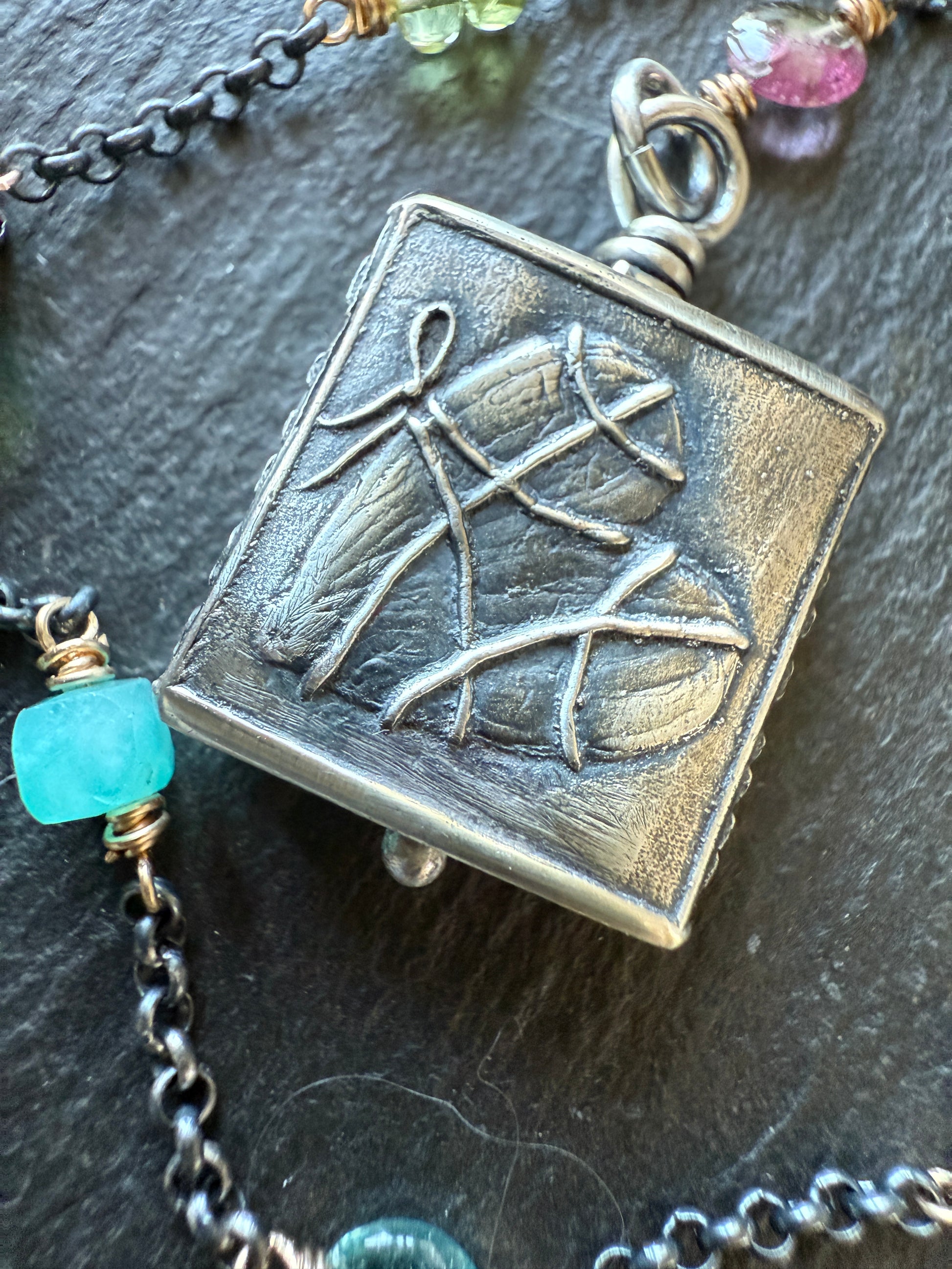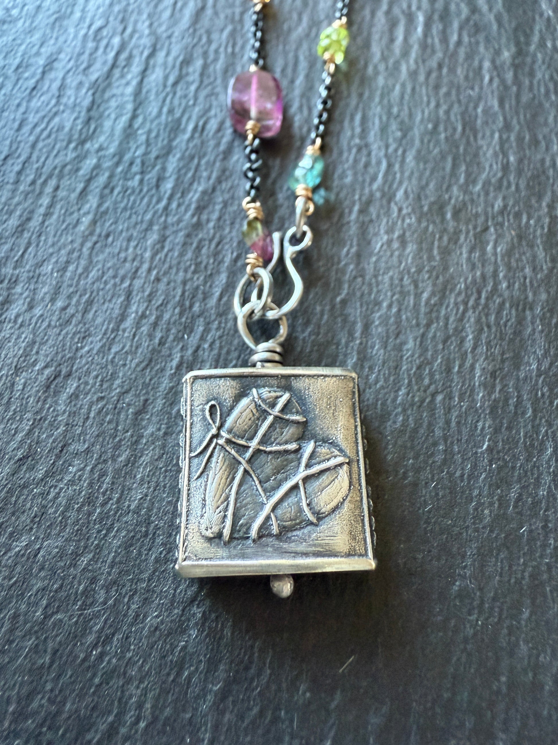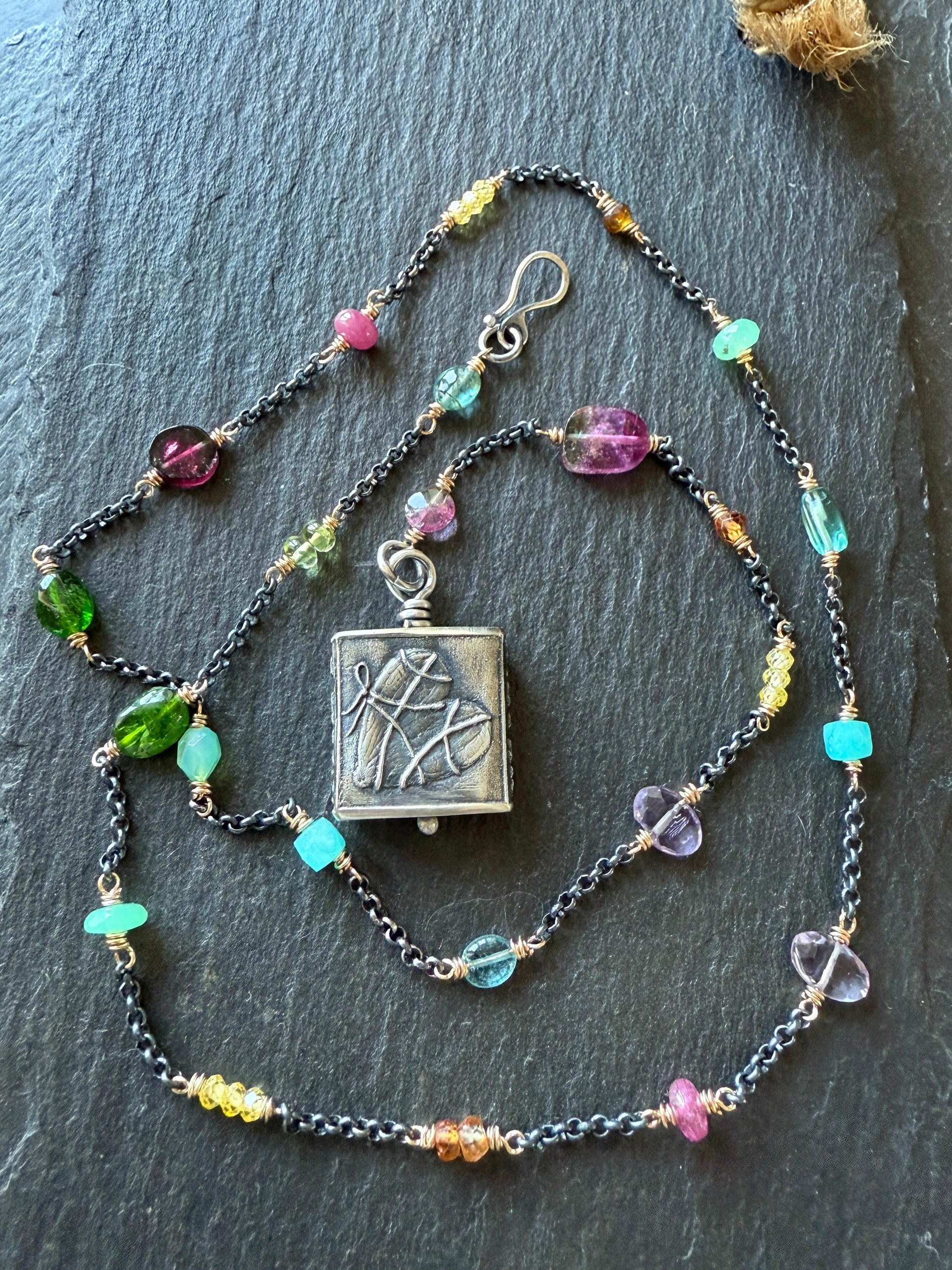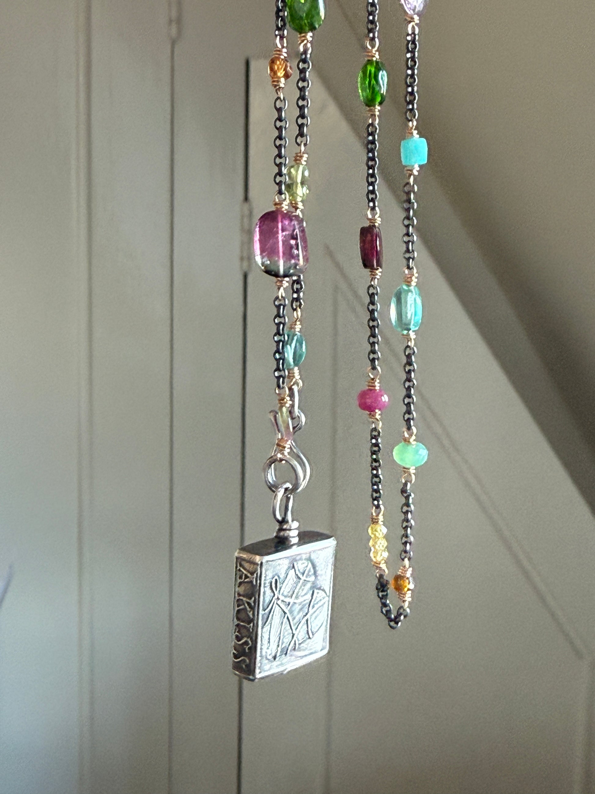 Featuring an Anne Choi heart sterling silver pendant. ‘A Kiss For This’ is scripted on the sides. This beautiful pendant hangs from a mix of wire wrapped gemstones on oxidised sterling chain and 14k gold fill wire. The necklace is front fastening with a hand forged hook. The drop length is 22” including the charm.
