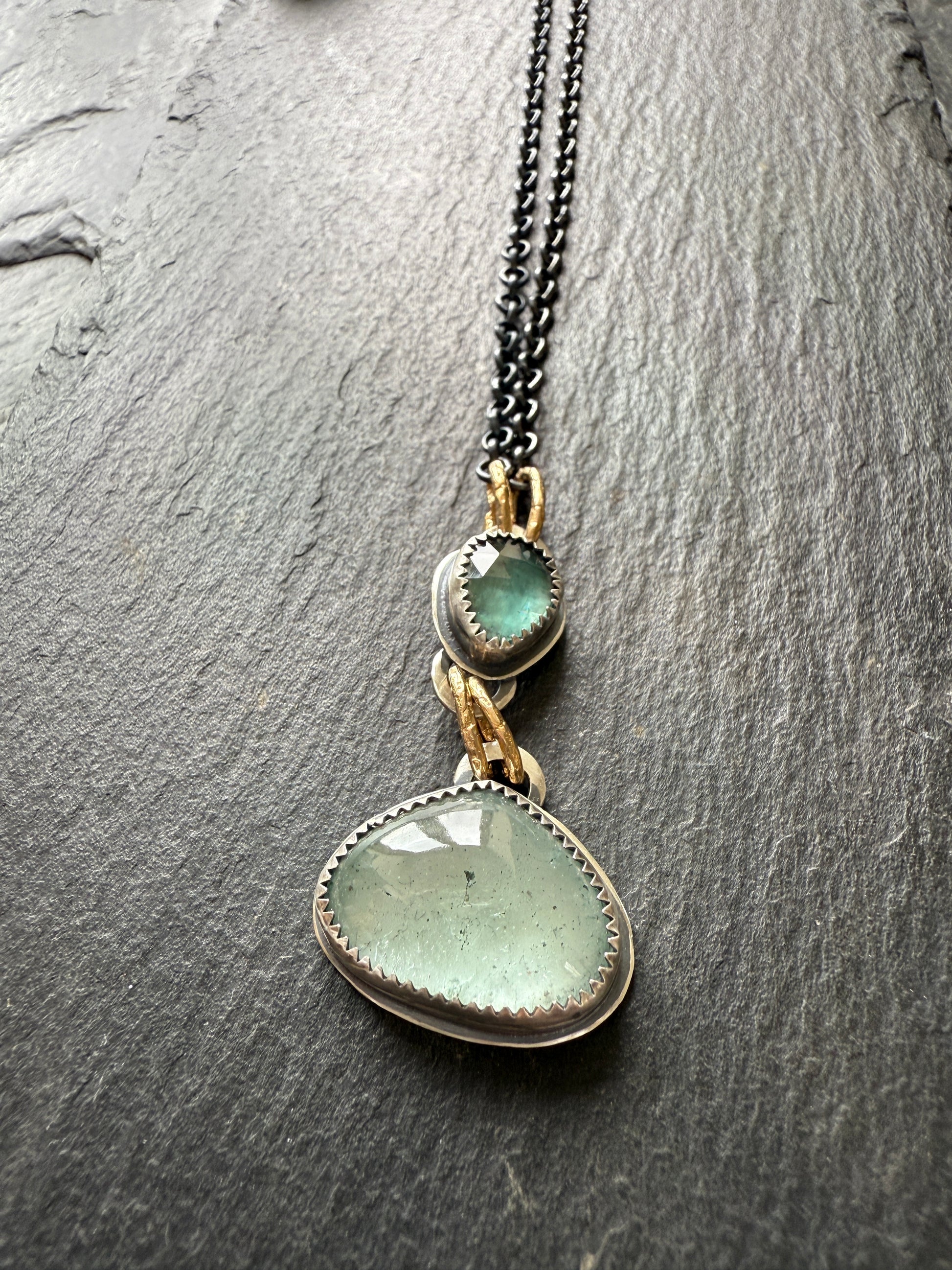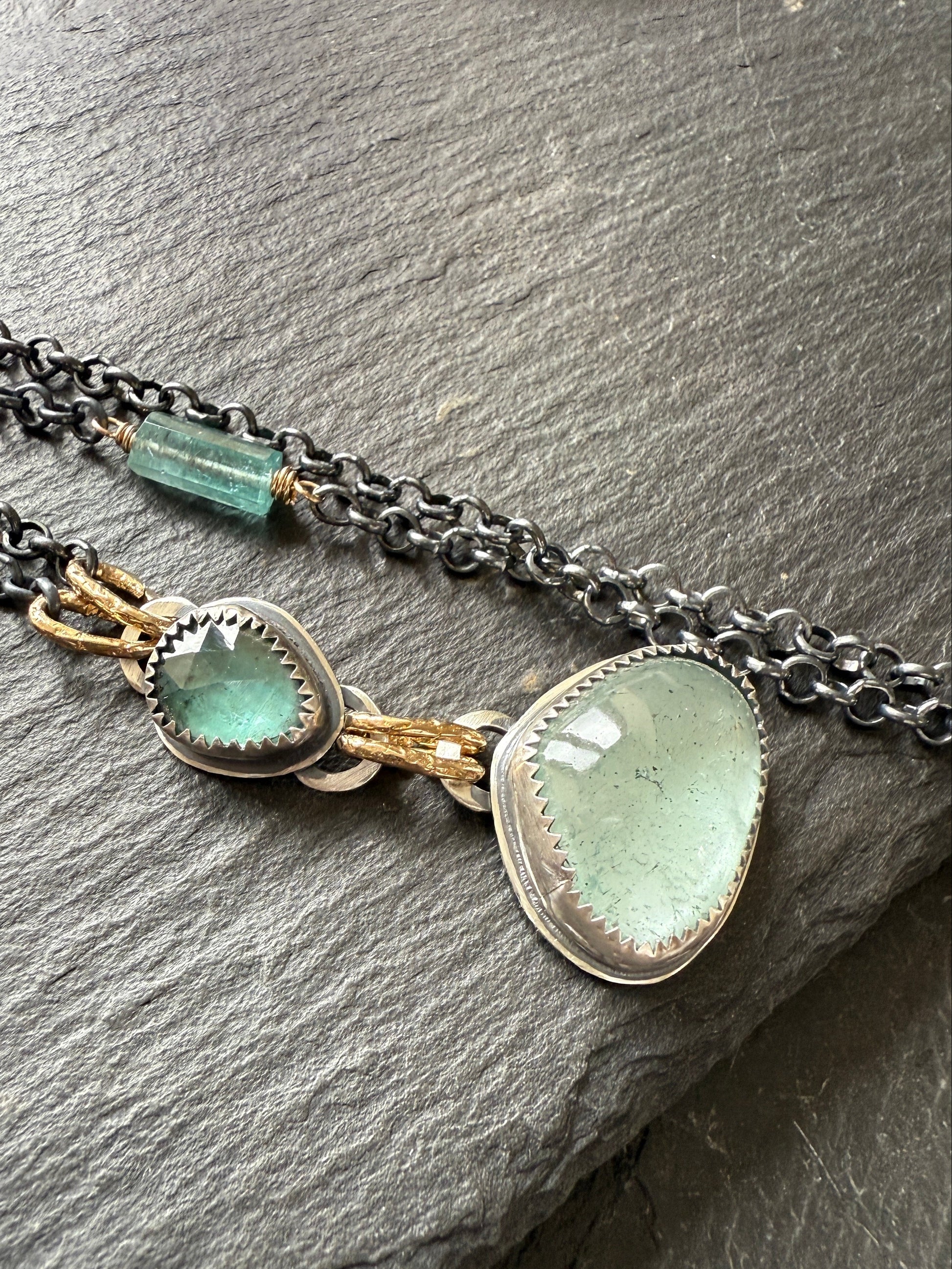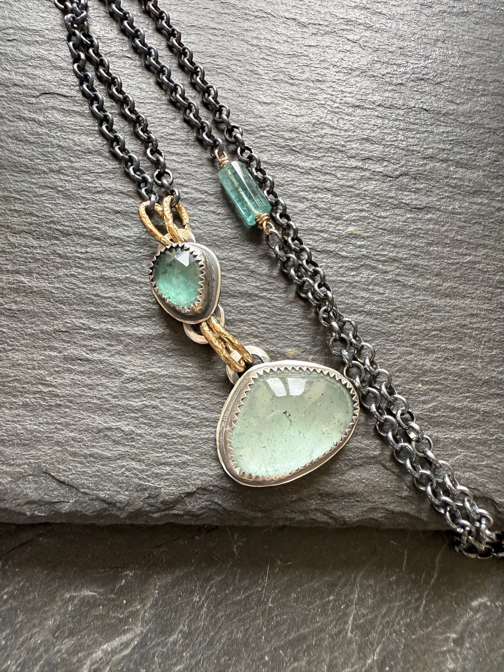 Featuring a pretty moss aquamarine and a kyanite gemstone. These pretties have been wrapped in fine and sterling silver, oxidised and polished to a rustic patina. The pendants hang from gold bronze links and a dark oxidised chain with a wire wrapped tourmaline stone.