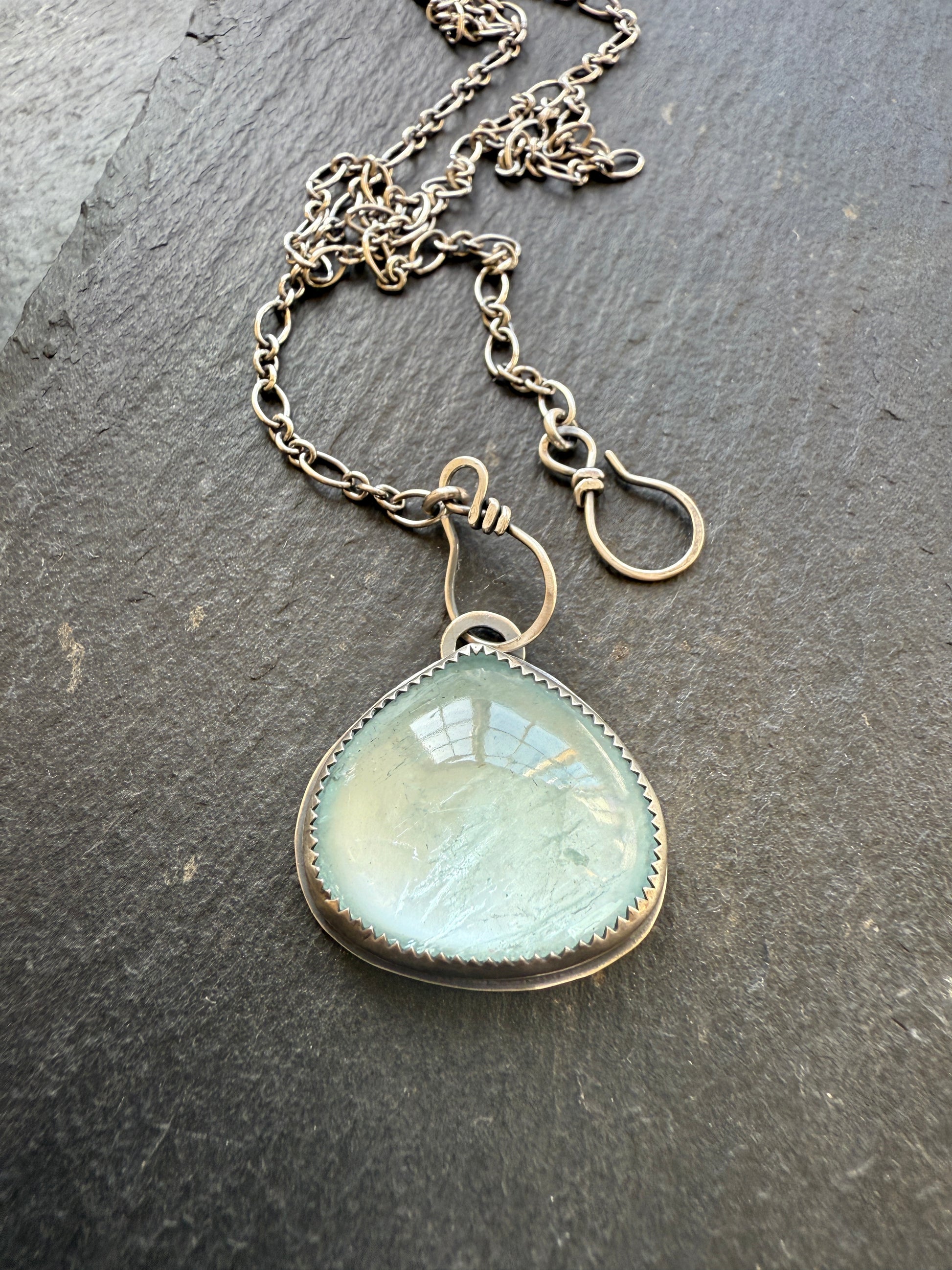 Featuring an amazing Aquamarine stone set in fine and sterling silver. This March birthstone is an ice blue and looks amazing with sterling silver. The stone measures 21mm x 24m and is 26.40 carats. The stone has some natural inclusions.