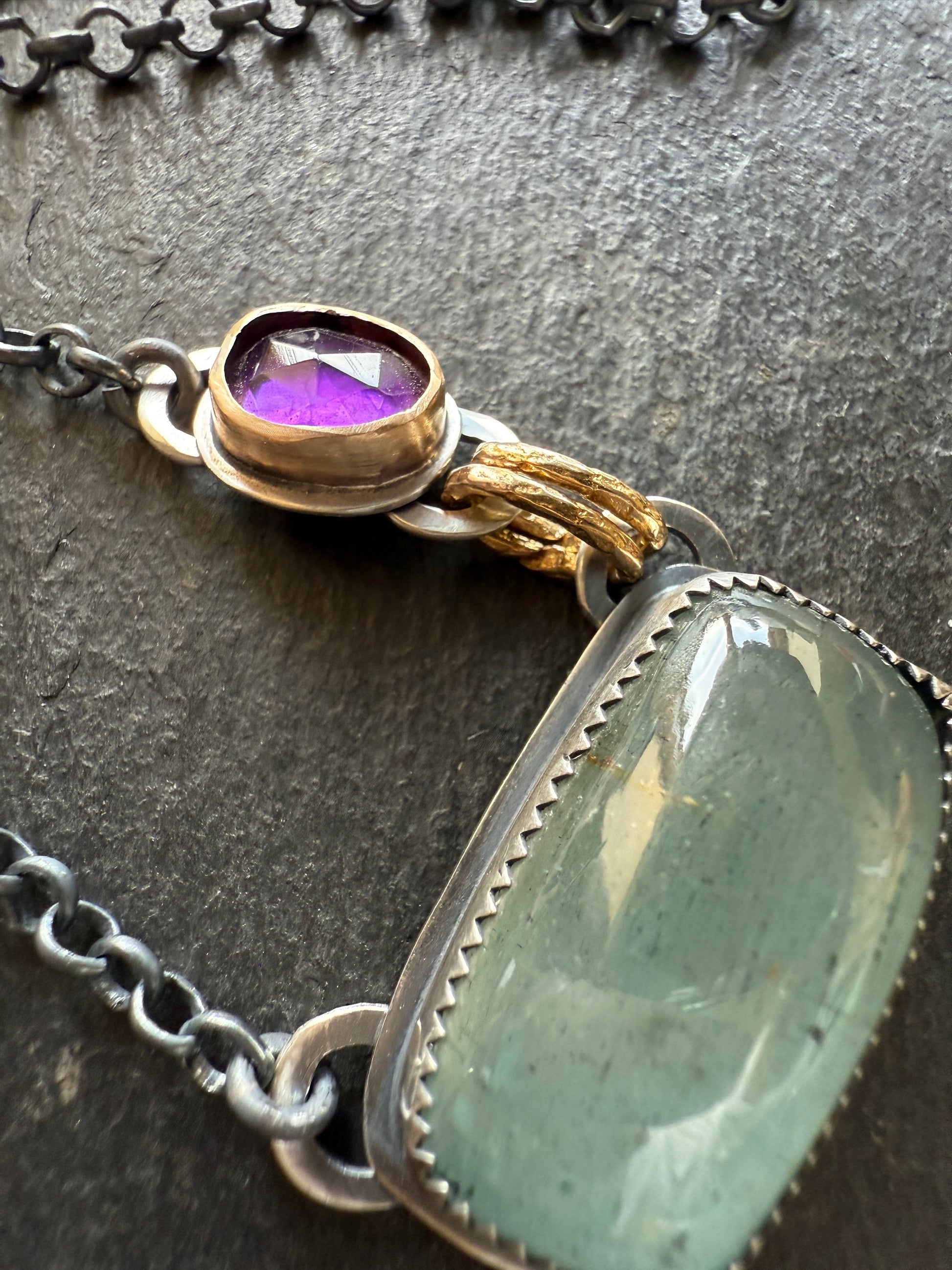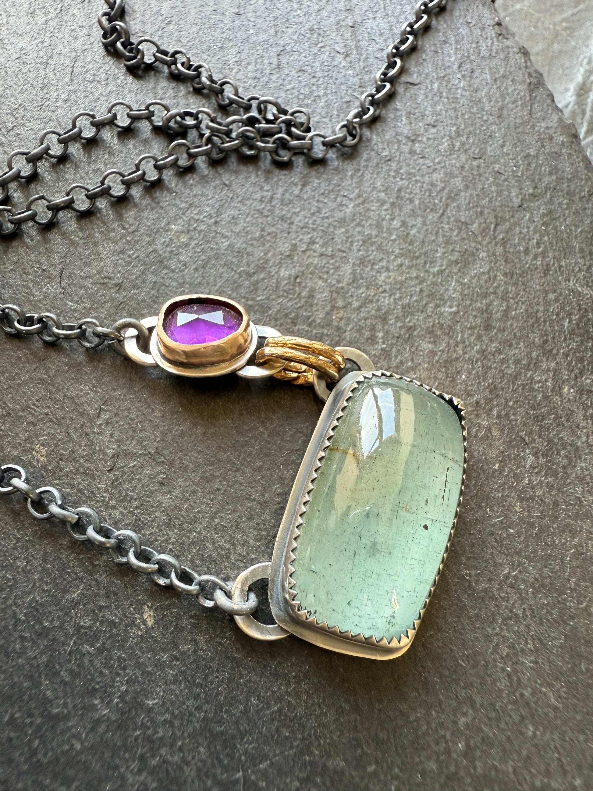 Featuring an Aquarium and Amethyst mixed metal necklace. The aquarium is set in fine and sterling silver, the amethyst in 14k gold fill on sterling silver. The oxidised chain is 16” approximately.