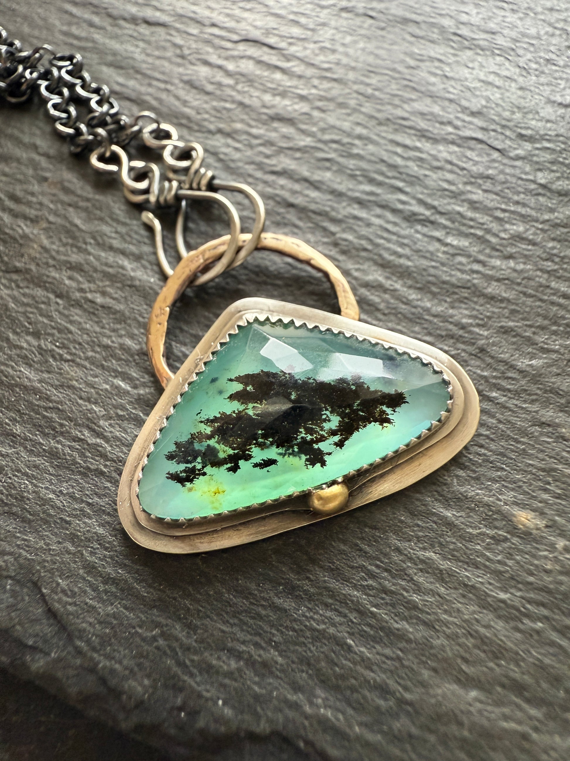 Featuring a stunning blue and green Andean opal with dendrites that look like ferns under the sea. This beauty is set in fine and sterling silver with an 18k gold accent and a gold bronze link. The stone measures 22mm x 12 mm excluding the setting. This mixed metal pendant hangs from a dark oxidised sterling silver 18” chain with hand forged hooks.