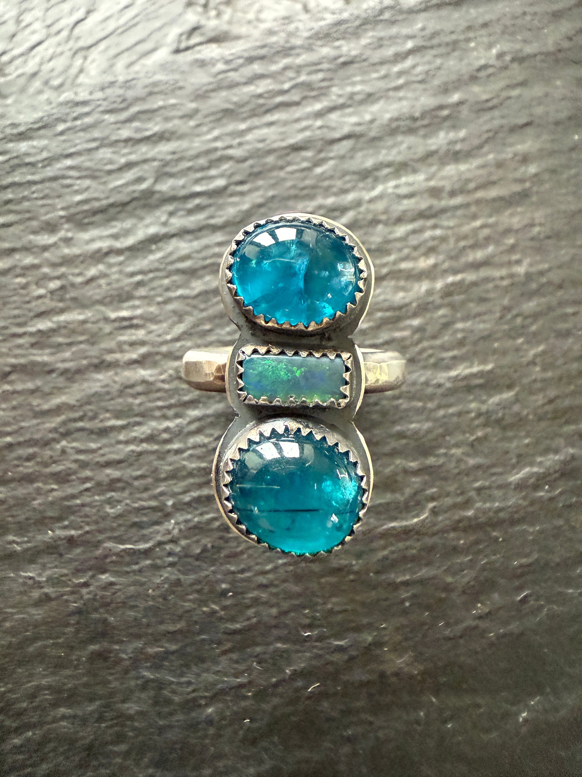 Featuring two blue apatite gemstones and a boulder opal, set in fine and sterling silver, oxidised and lightly polished to a rustic patina. This double stone ring fits a US 8, UK P 1/2. The length is approximately 1”.