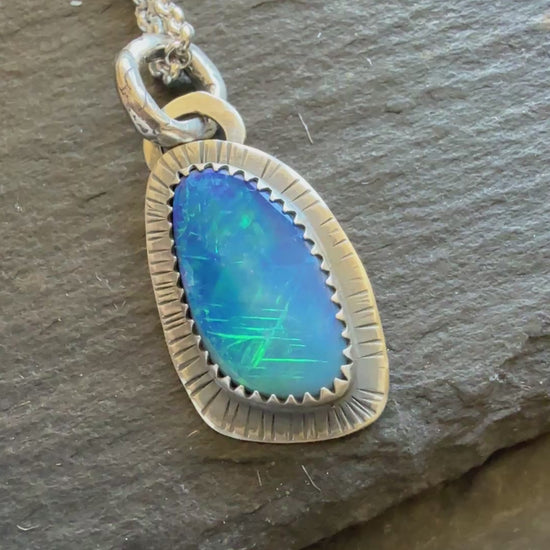 The opal is set in fine and sterling silver, oxidised, hand stamped and lightly polished.