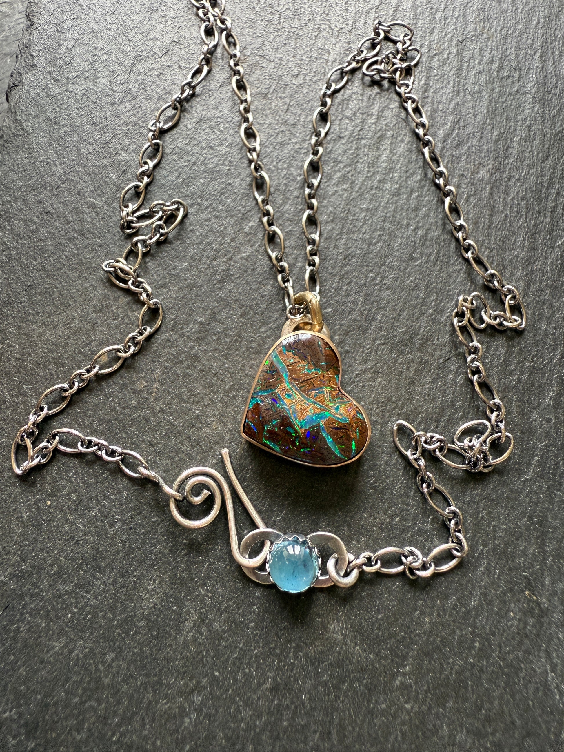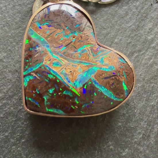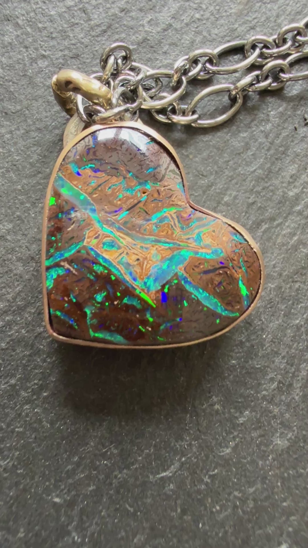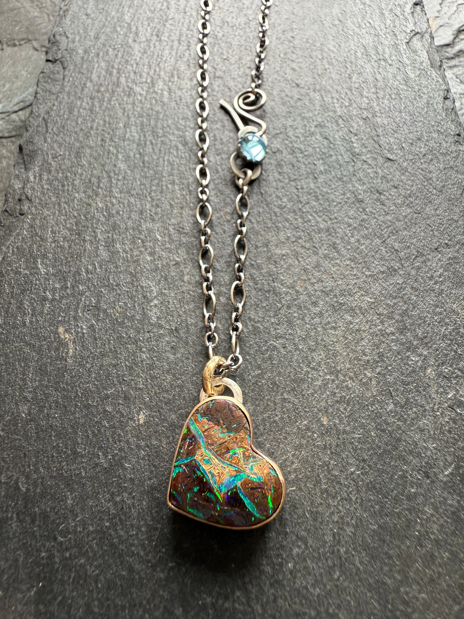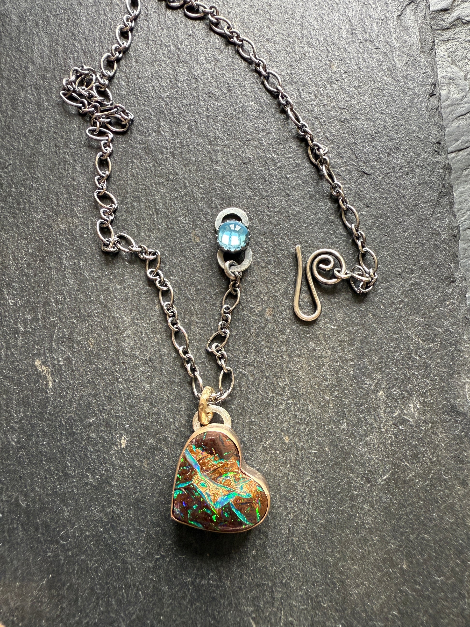 Featuring a gorgeous green and blue heart boulder opal.The gemstone is set in 14k gold fill and sterling silver. The pendant hangs from a pretty 18” lightly oxidised sterling chain with a blue topaz hook closure. The opal measures 14mm x 16mm approximately.