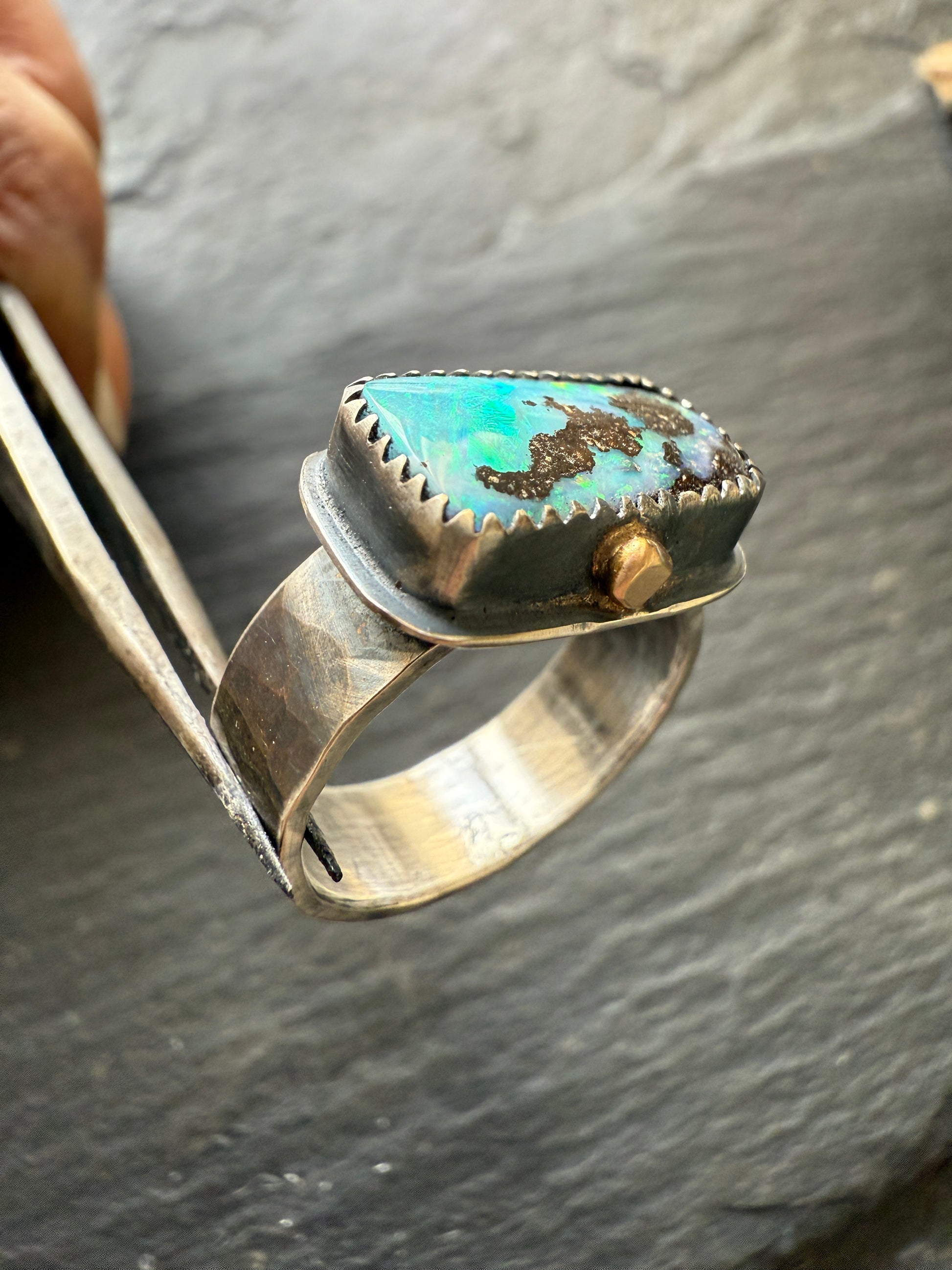 Ocean blue boulder opal ring. This lovely opal has beautiful colour, blue and green with speckles of yellow and pink.