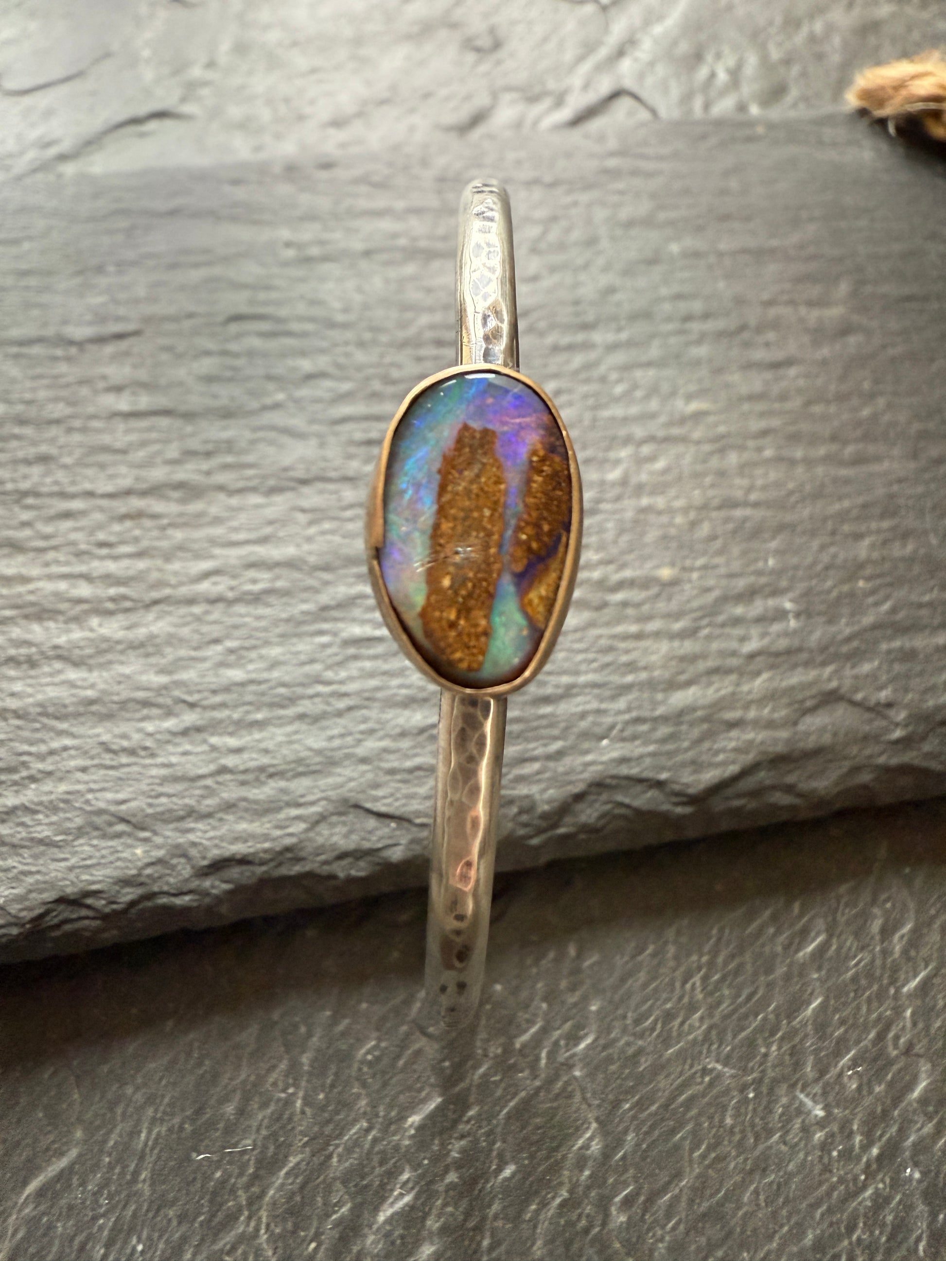 Featuring a bezel set boulder opal charm set in sterling silver and gold fill. This gorgeous stone sits atop a sterling silver bangle which has been hammered, oxidised and polished. The bracelet will fit a 6 - 6.5” wrist. The pendant measures 16mm x 8mm approximately.