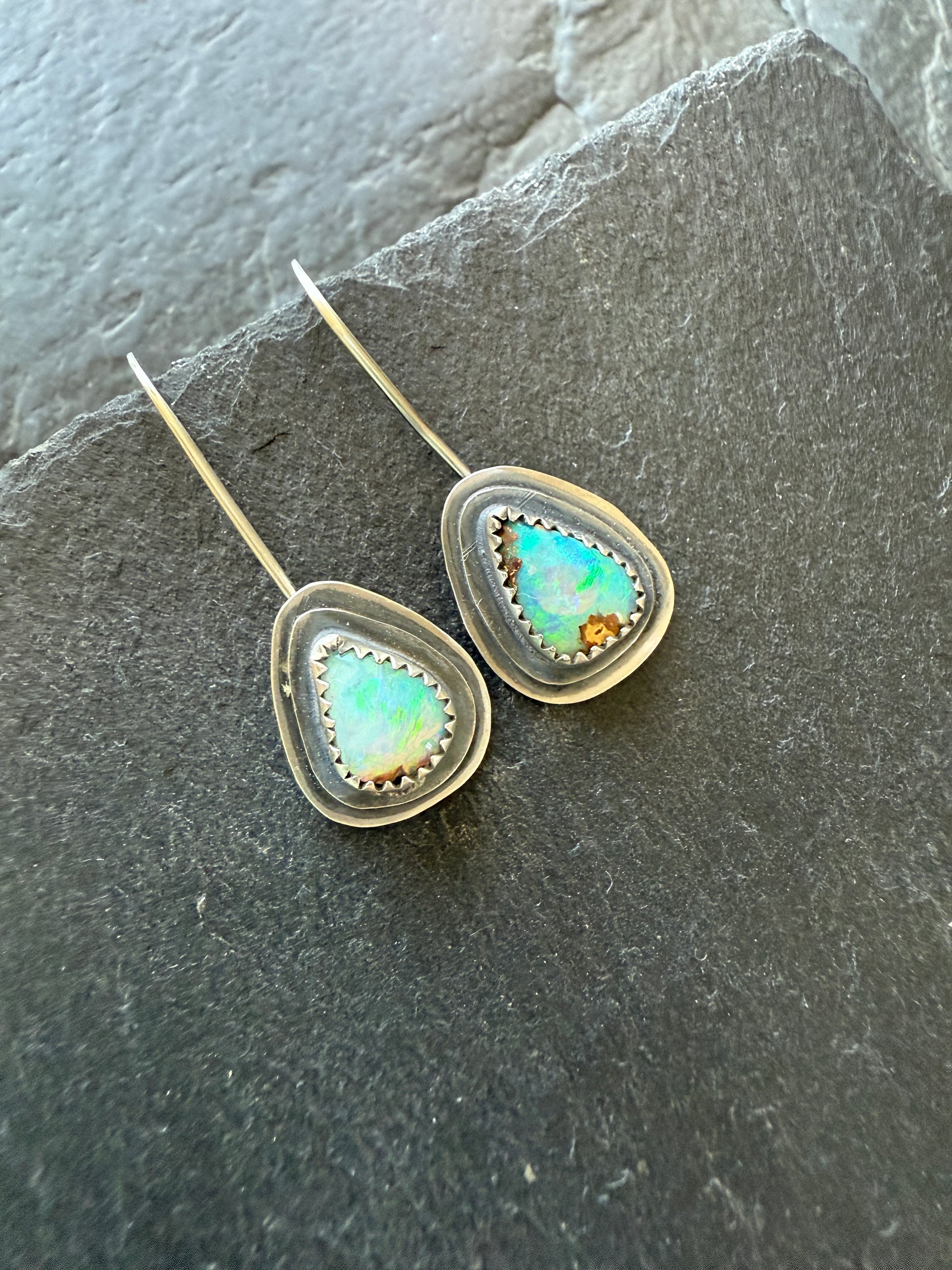 Featuring modern rustic boulder opal earrings. I have bezel set these beauties in layered, re cycled sterling silver, oxidised, hammered and polished to a rustic patina. The stones measure approximately 11 x 8mm / 10mm x 8mm approximately. Drop is 32mm.