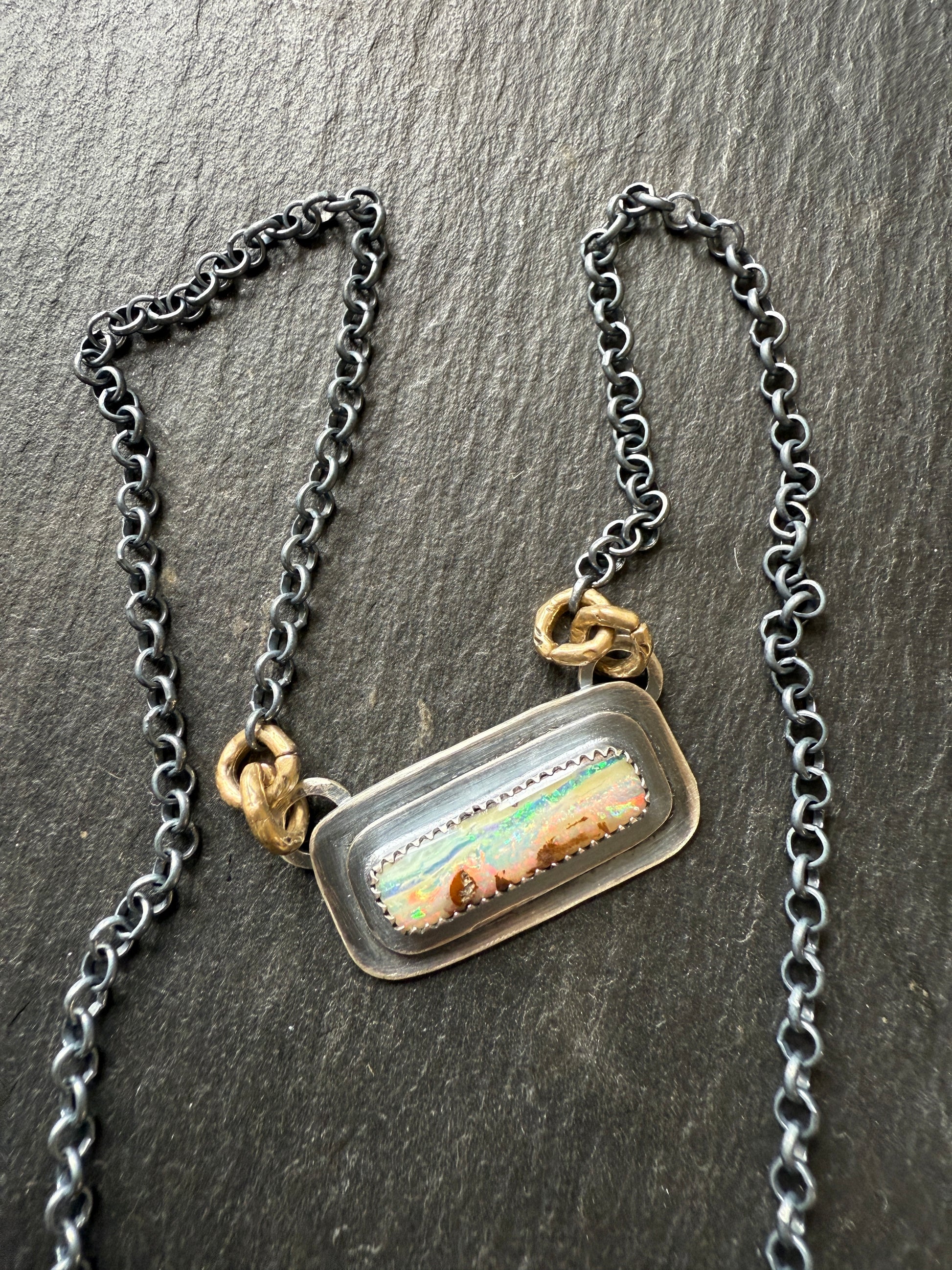 Featuring a gorgeous boulder opal in a layered setting of sterling silver. The pendant hangs from gold bronze links and a dark sterling silver chain. The chain is 15.5” approximately.