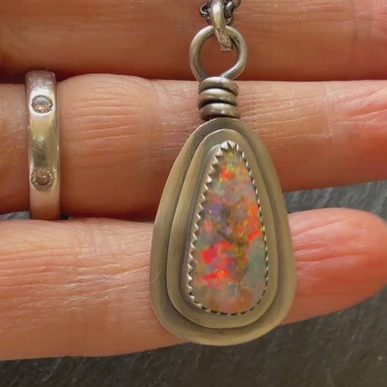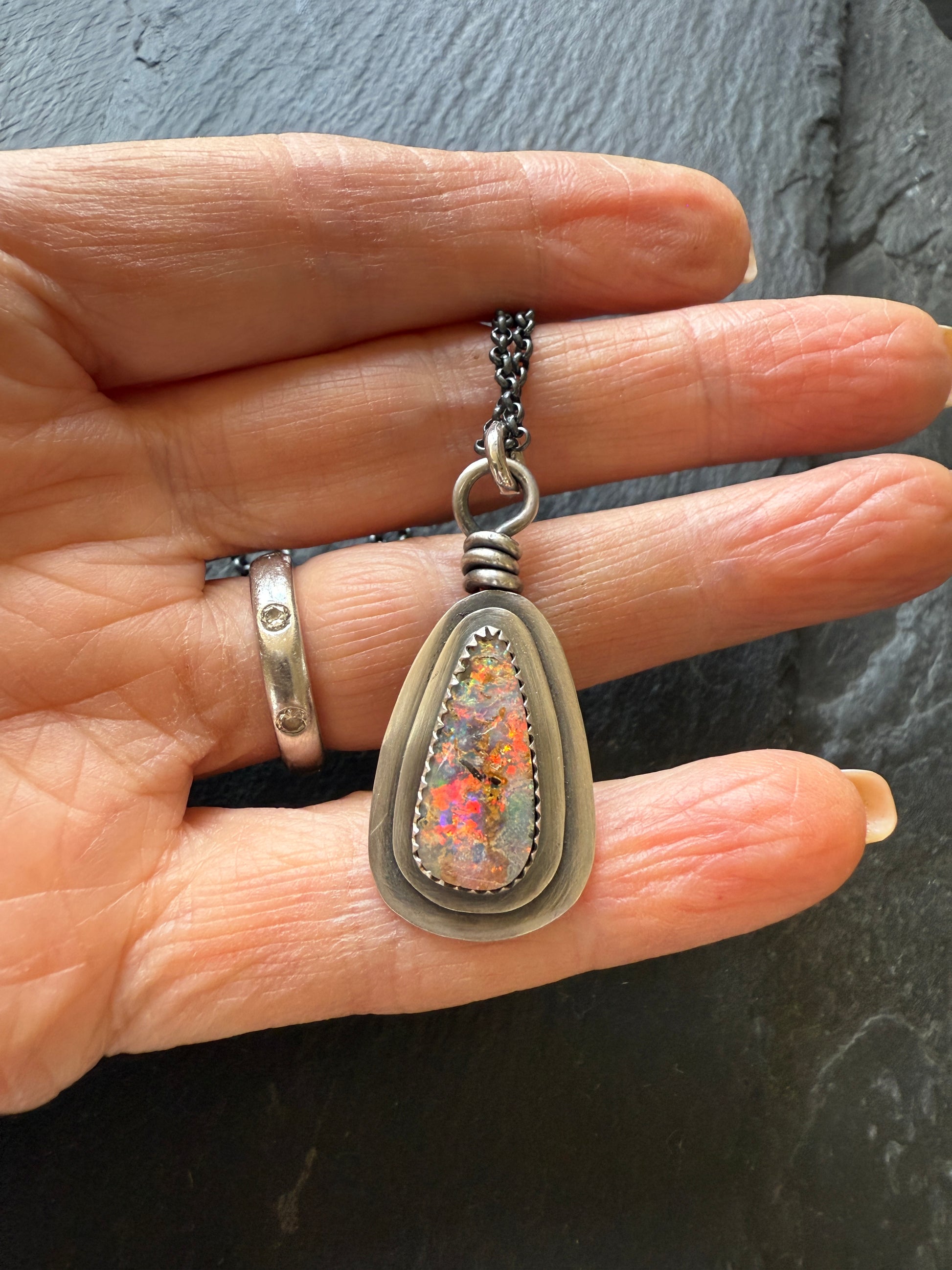 Featuring a lovely boulder opal which is full of colour. This beauty is set in layered sterling silver. The pendant measures 34mm x 15mm approximately and hangs from a sterling link and a dark oxidised sterling silver 18” chain.