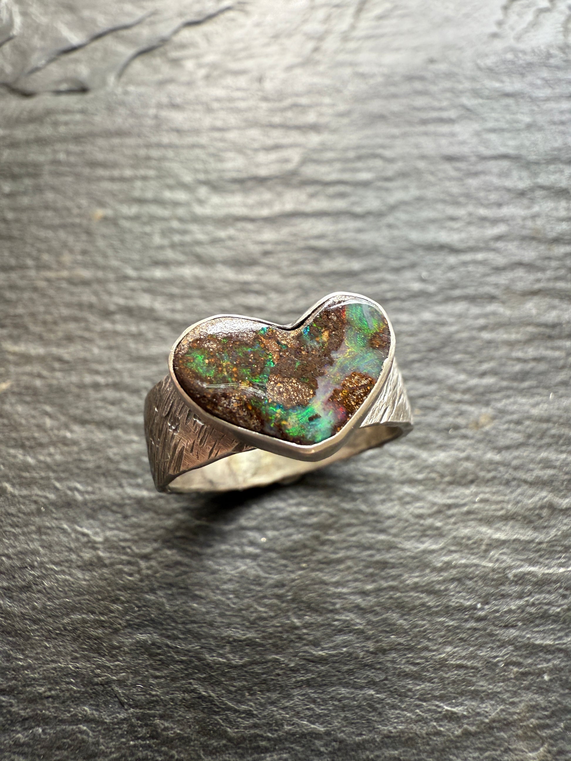 Featuring a heart boulder opal. This pretty stone is set in fine and oxidised sterling silver with a texturised ring band. The ring size is a US 7.