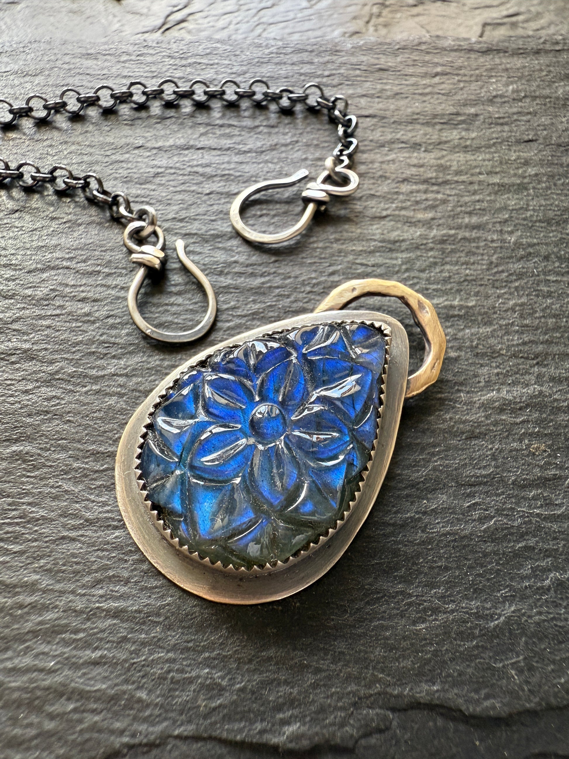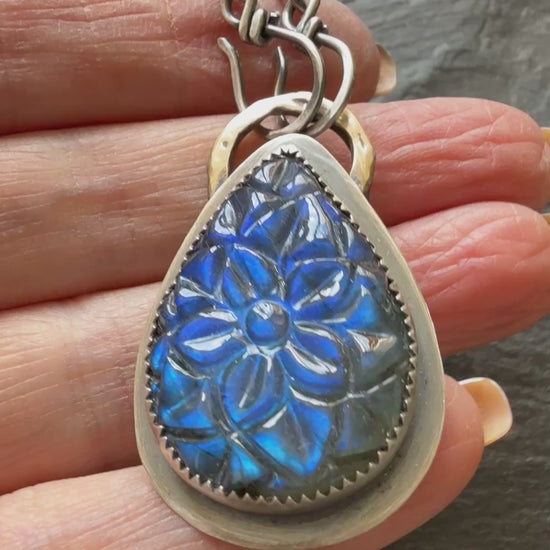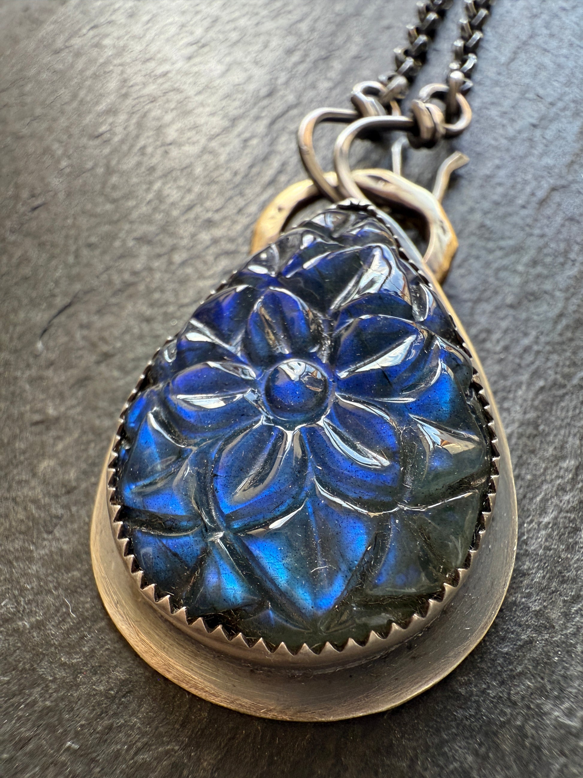 Featuring a beautiful carved labradorite gemstone set in fine and sterling silver. The stone measures 27mm x 18.5mm. The pendant hangs from two sterling hand forged hooks and an 18” chain. The necklace hangs a little longer at 19” with the hooks (approximately).