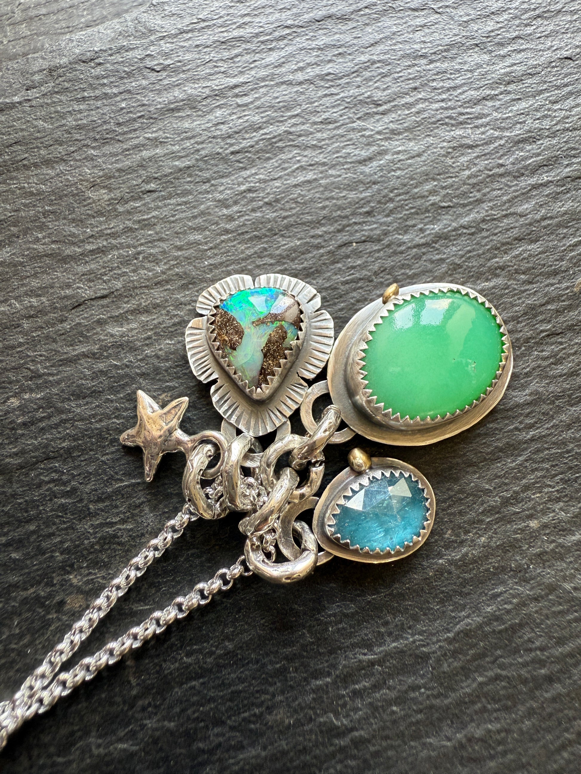 Featuring a charm pendant necklace in which I have bezel set a gorgeous boulder opal, a green Chrysoprase and a blue kyanite. These beautiful gems are set in fine and sterling silver with gold accents. The pendants hangs from a sterling chain with a sterling star charm. The opal measures 12mm x 9mm, kyanite 10mm x 6 mm, the Chrsoprase 16mm x 13mm approximately. The Sterling chain is 19”.
