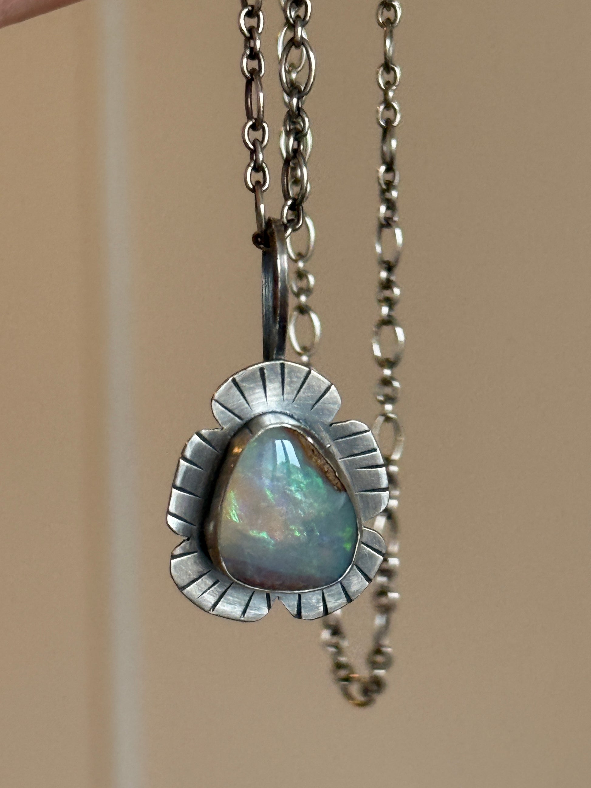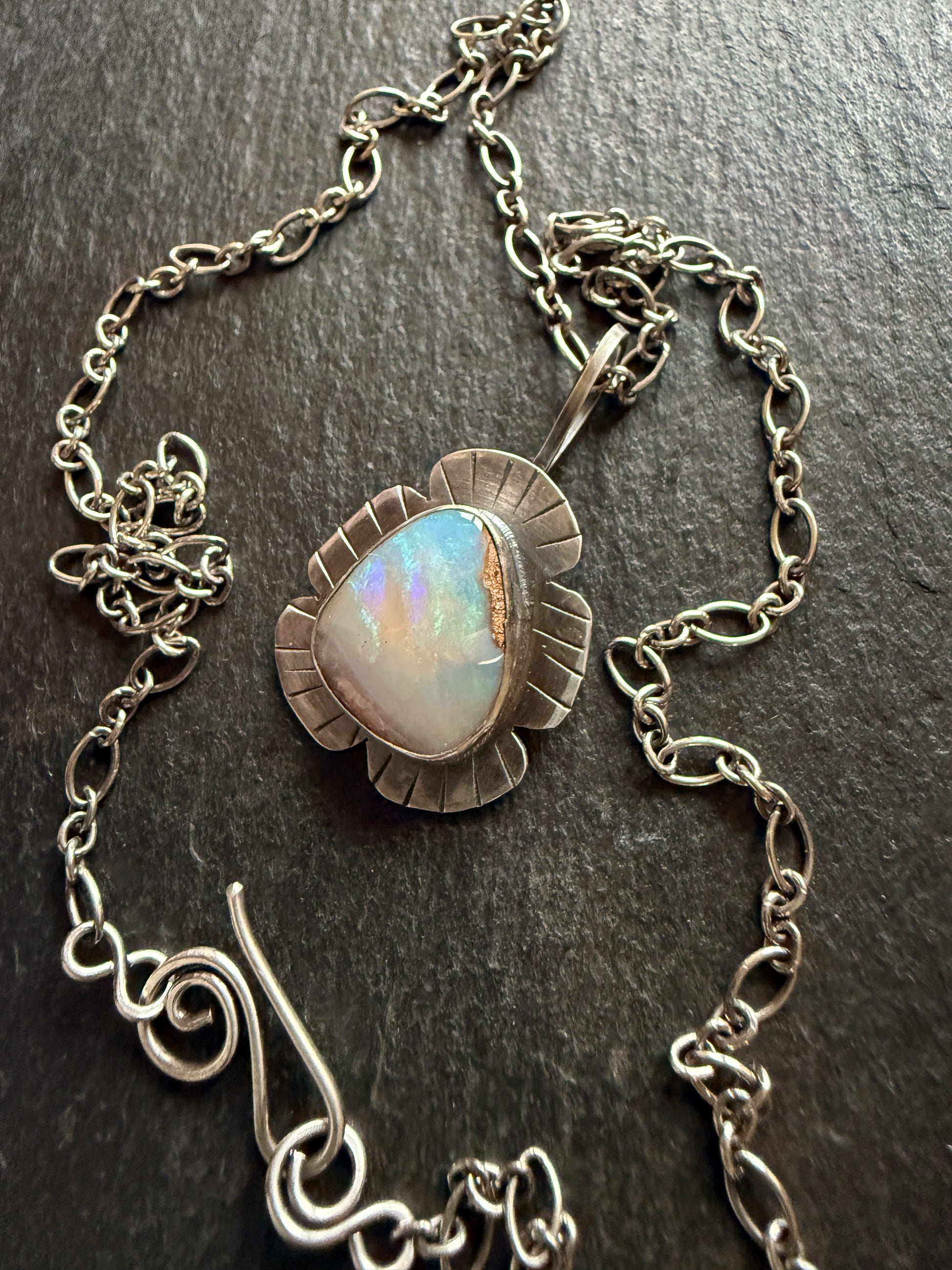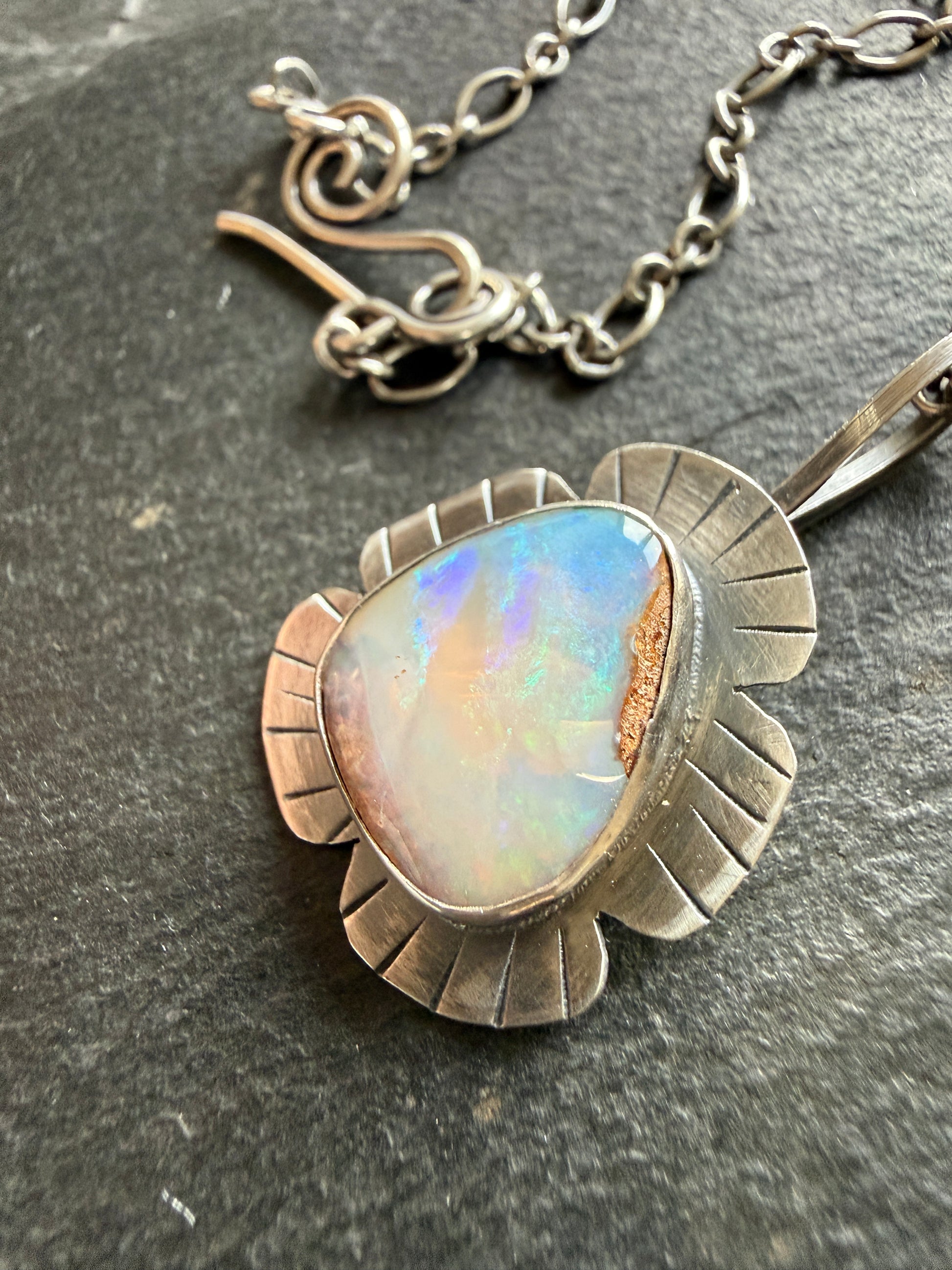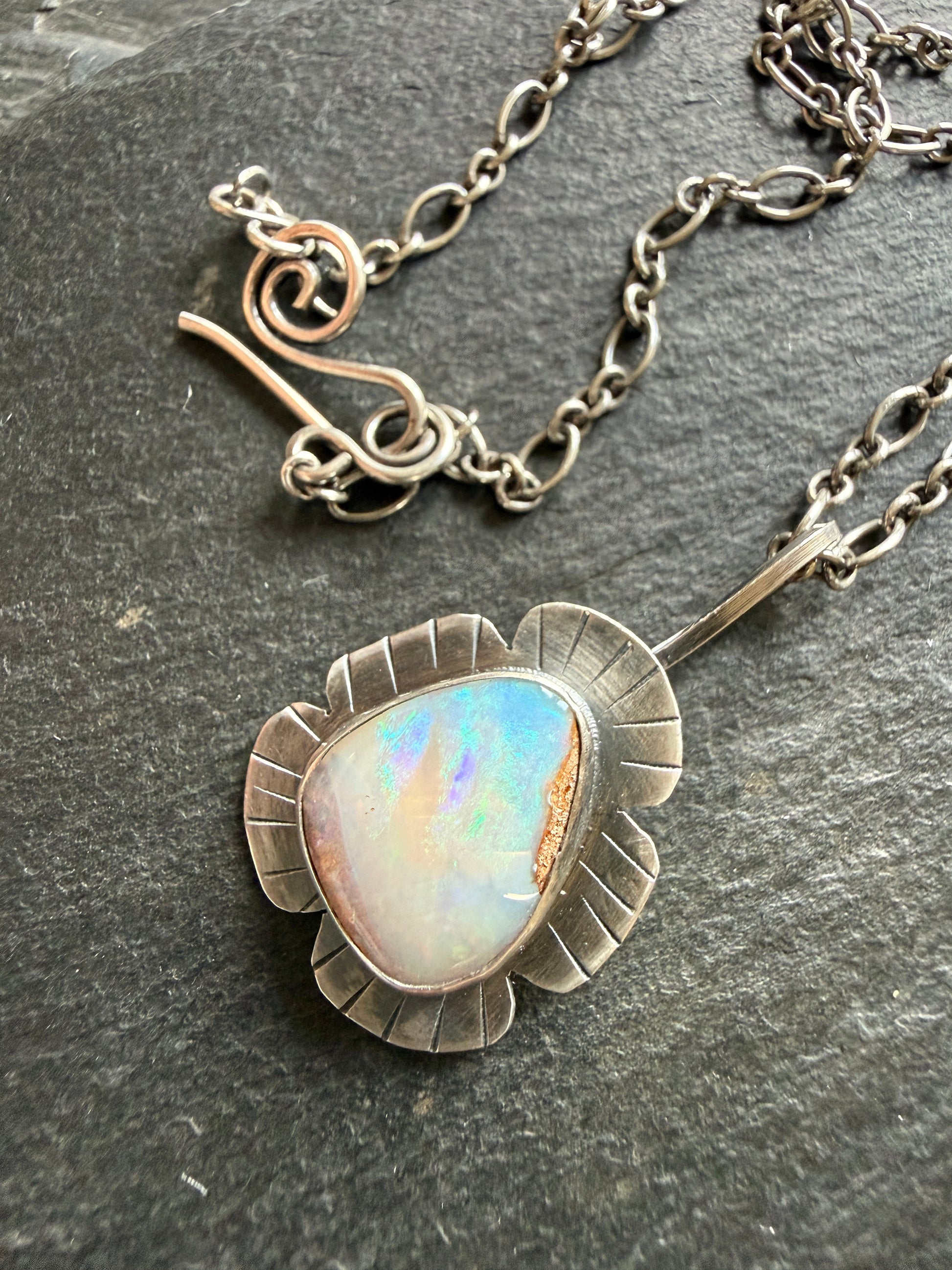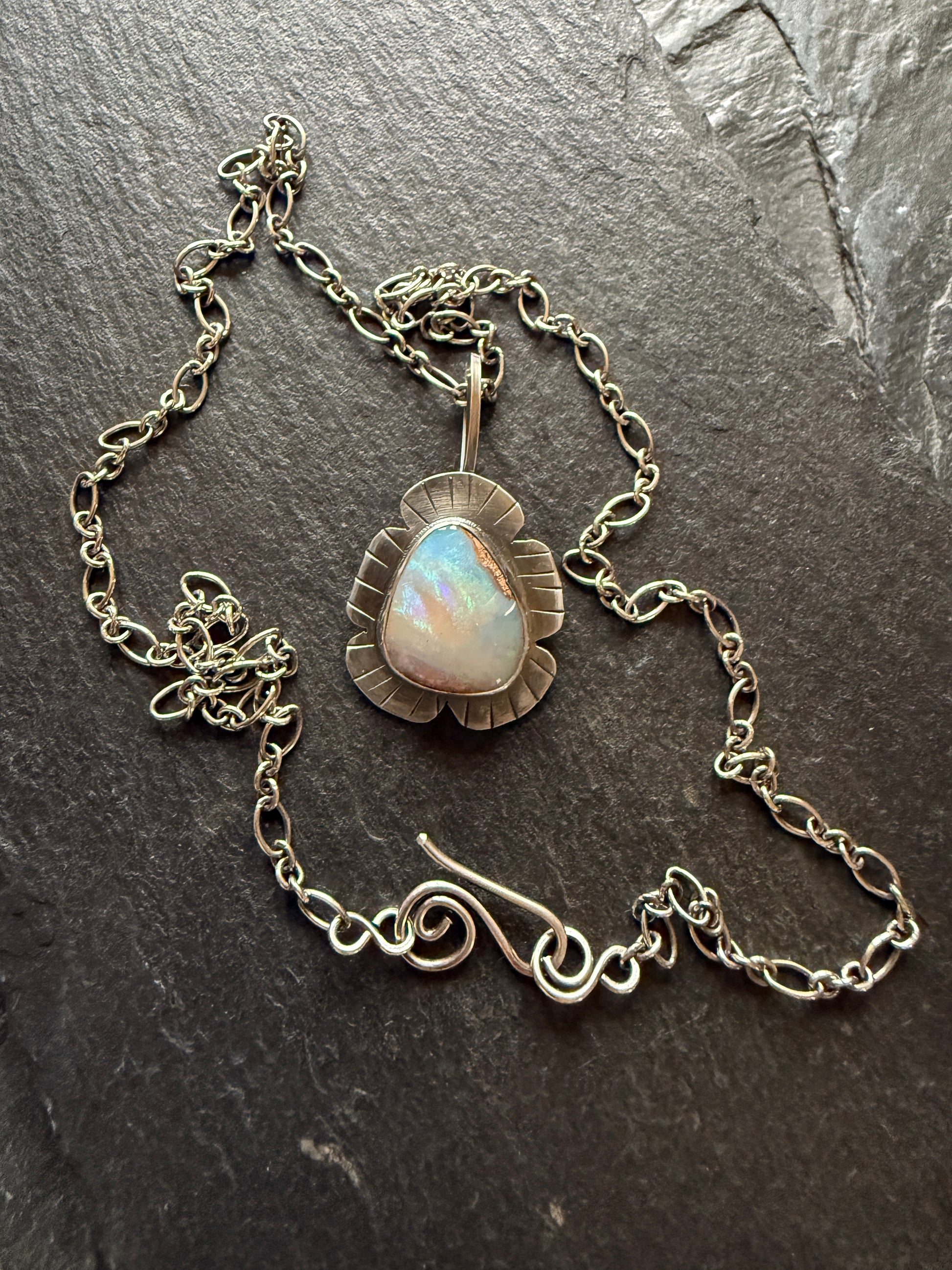 Featuring a boulder opal necklace set in fine and sterling silver. This stone has lovely blue, green and purple and orange colour play. The stone measures 14mm x 12mm and is 5.35cts. The pendant hangs from a pretty slightly oxidised sterling silver 18” chain.