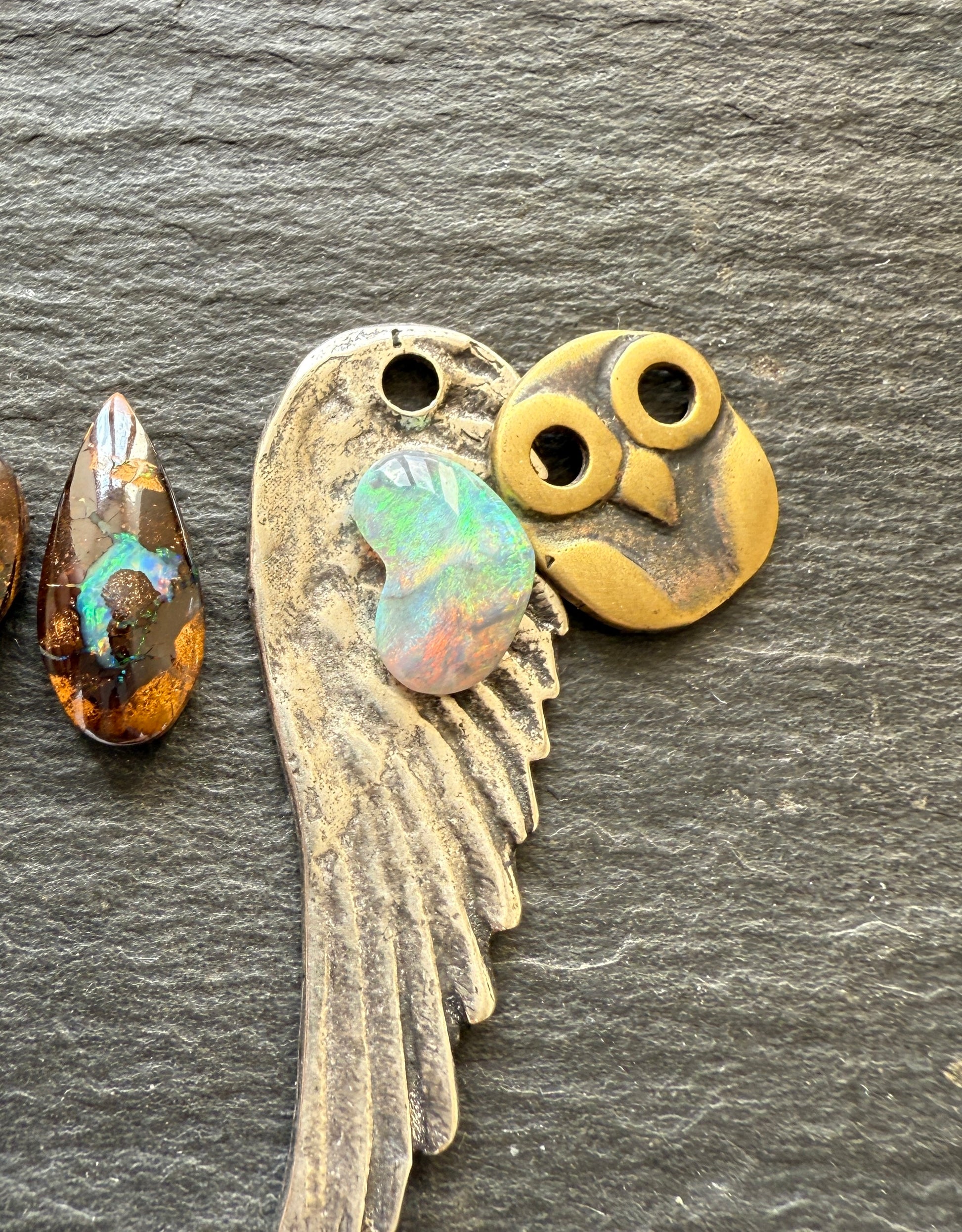 feather charm necklace featuring a sterling silver feather charm, 2 x boulder opals, a gold bronze heart charm and brass owl charm to hang from an 18” sterling silver chain.