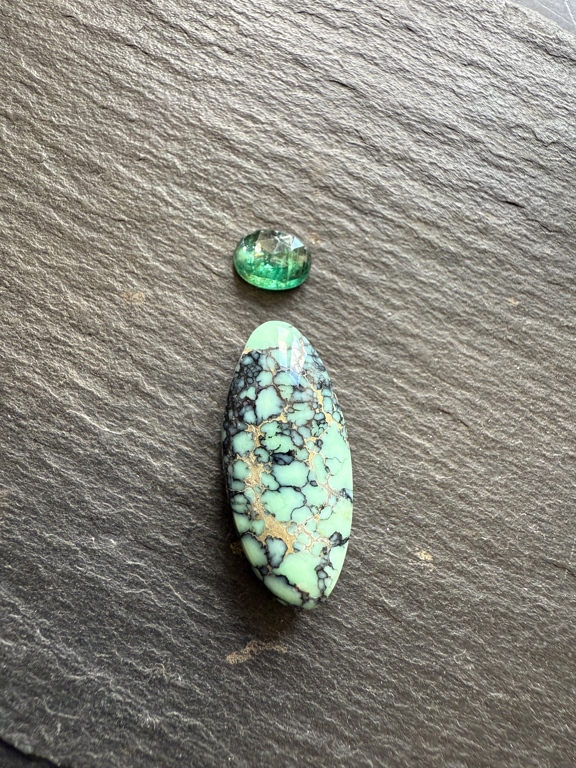 1. Turquoise and kyanite necklace set in fine and sterling silver with an 18k gold accent. The pendant will hang from gold bronze links and an 18” sterling silver chain - £360.00