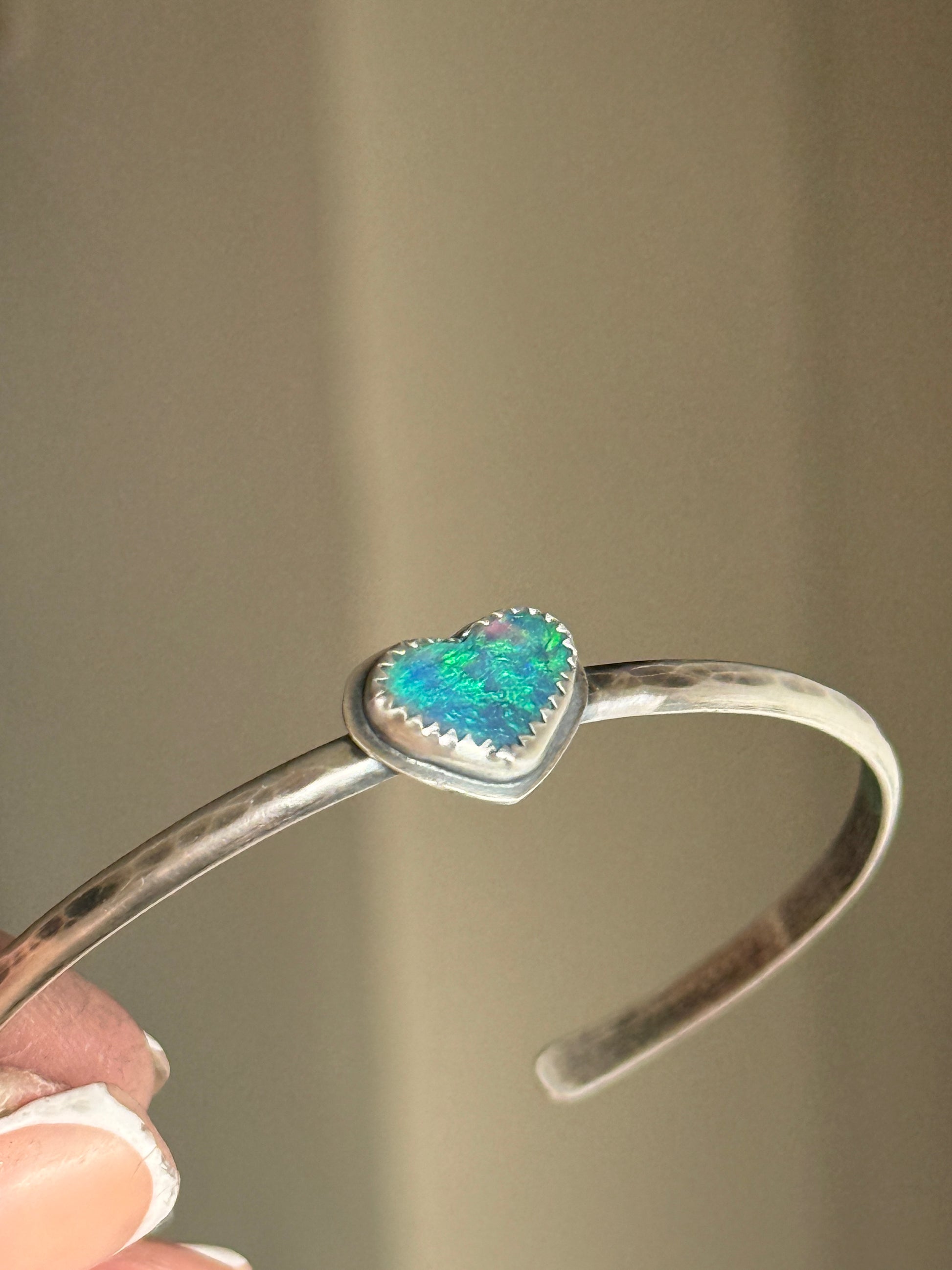 Featuring a heart Boulder Opal in a gorgeous blue with pops of green, sits atop a sterling silver bangle which has been hammered, oxidised and lightly polished. The bracelet will fit a 6 - 6.5” wrist. The pendant measures 10mm x 8mm approximately.