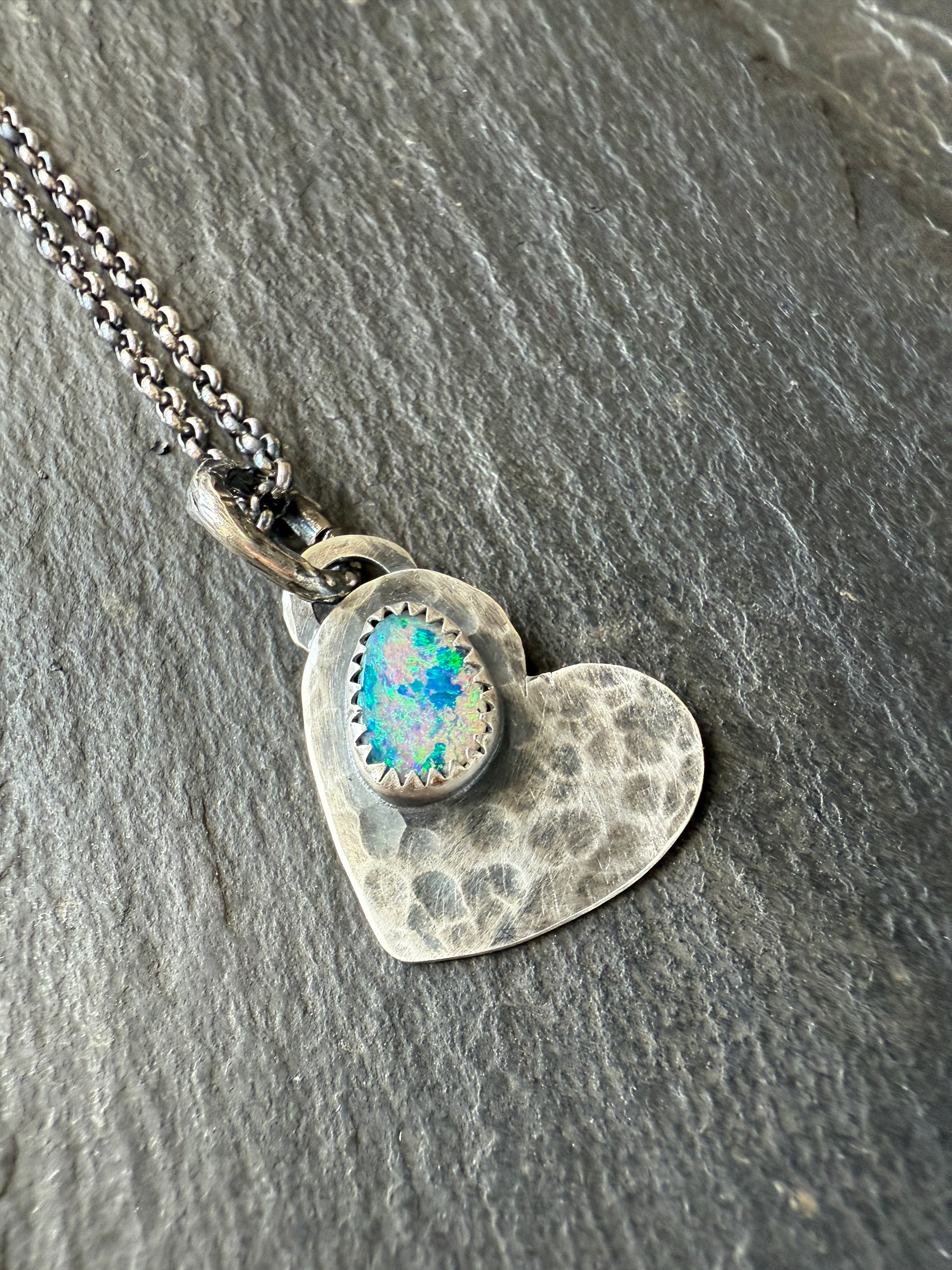 Featuring a hand fabricated sterling heart charm with a dainty boulder opal. This little beauty hangs from a rustic sterling link and a lightly oxidised sterling silver chain of 16 inches. This stone has blue and green colour play.