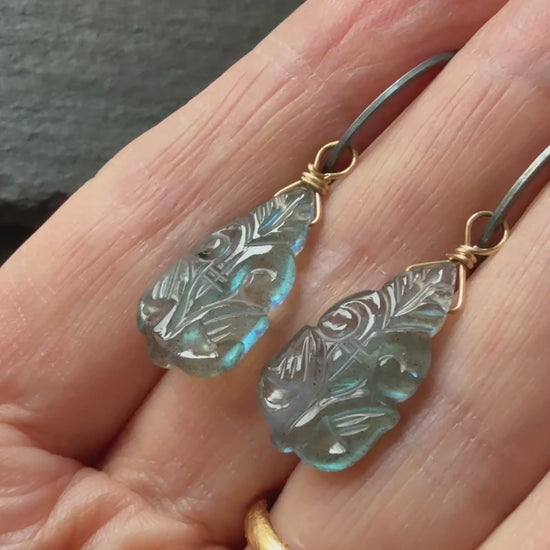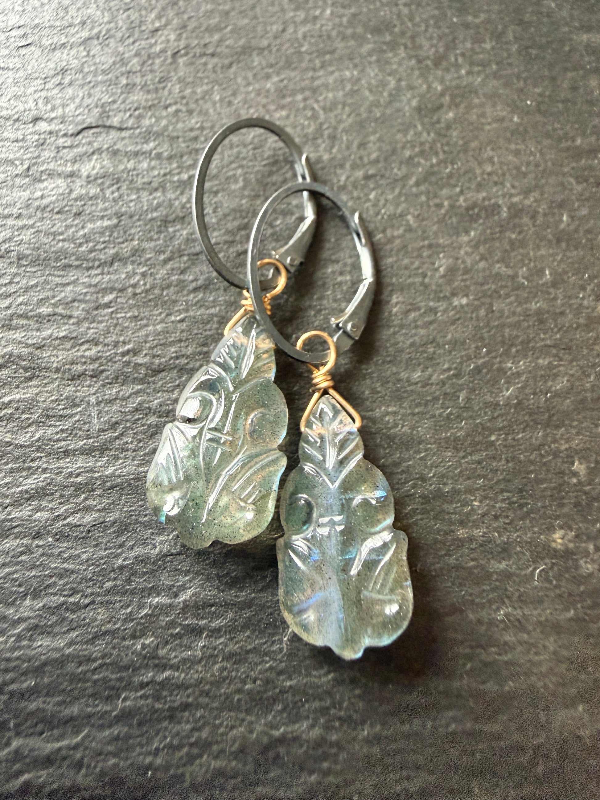 Featuring carved labradorite stones. Labradorite is predominantly grey with blue or green flash. These lightweight stones have some lovely blue flash. They are wire wrapped in 14k gold wire and dark oxidised oval earwires. Drop is approximately 40mm.