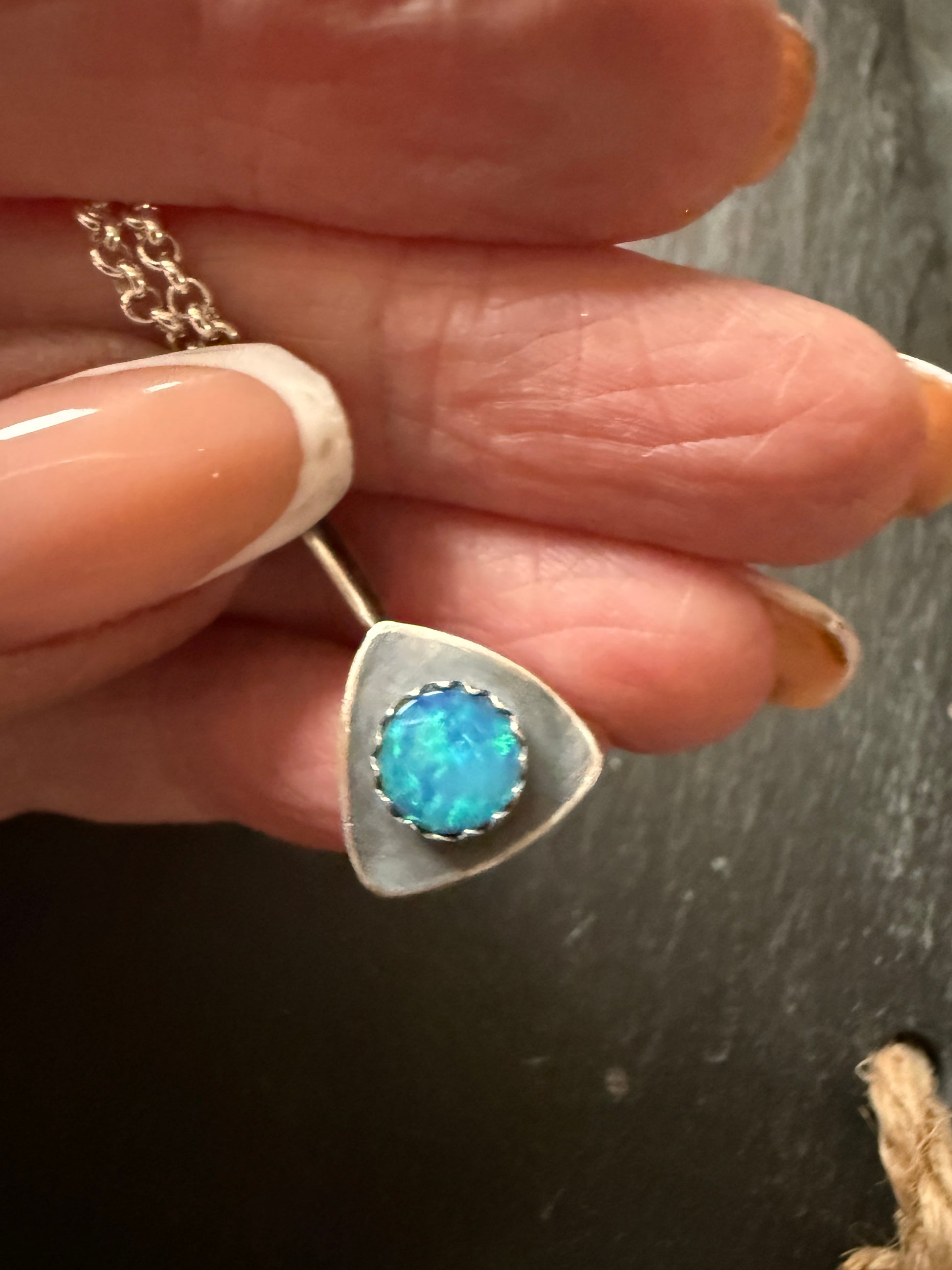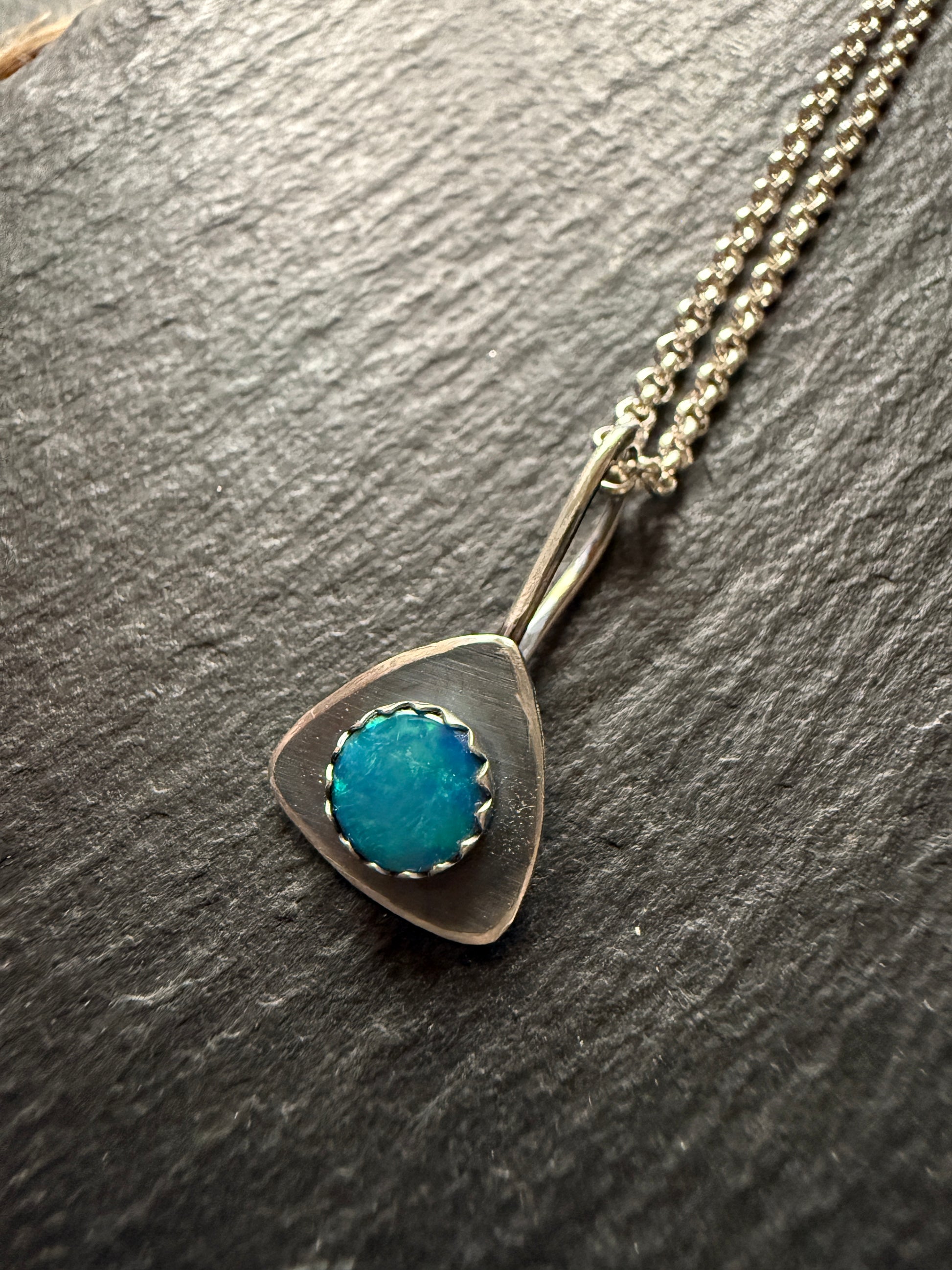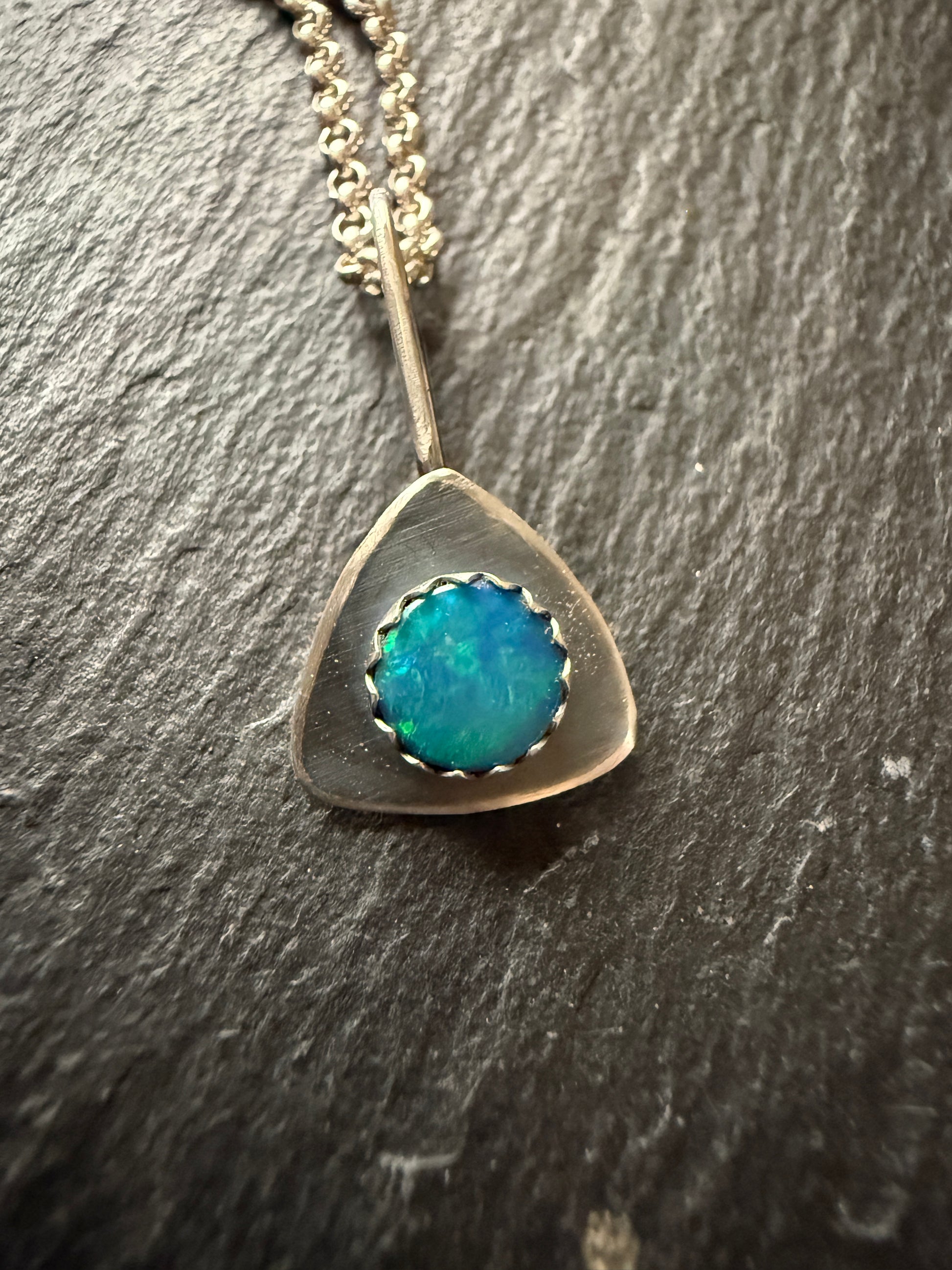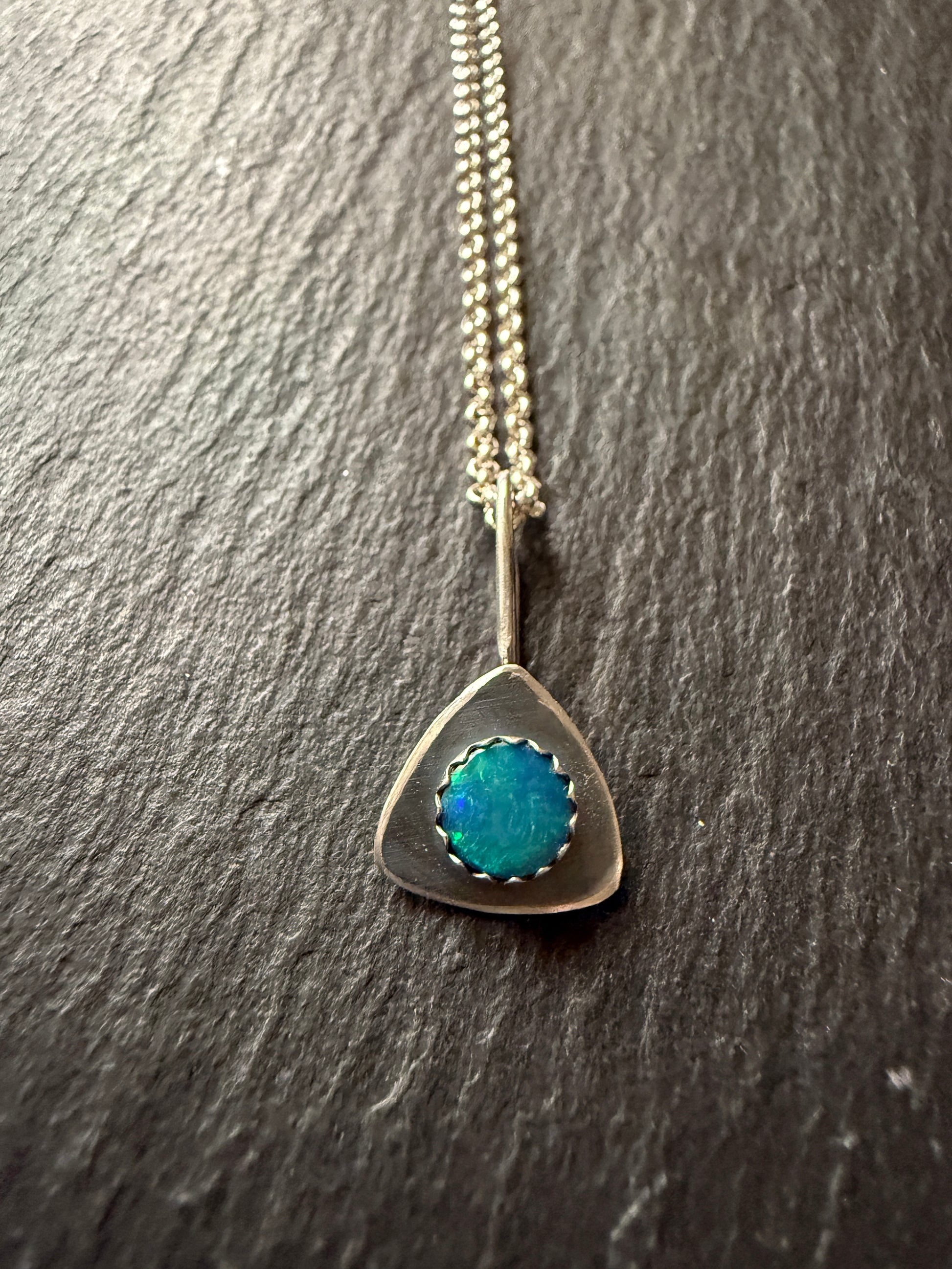 Dinky Australian blue and green colour play opal necklace. A sweet 6mm opal is set in fine and sterling silver, it hangs from an 18” sterling silver shiny chain. The pendant length is 22mm approximately including the bail. Perfect little layering necklace.