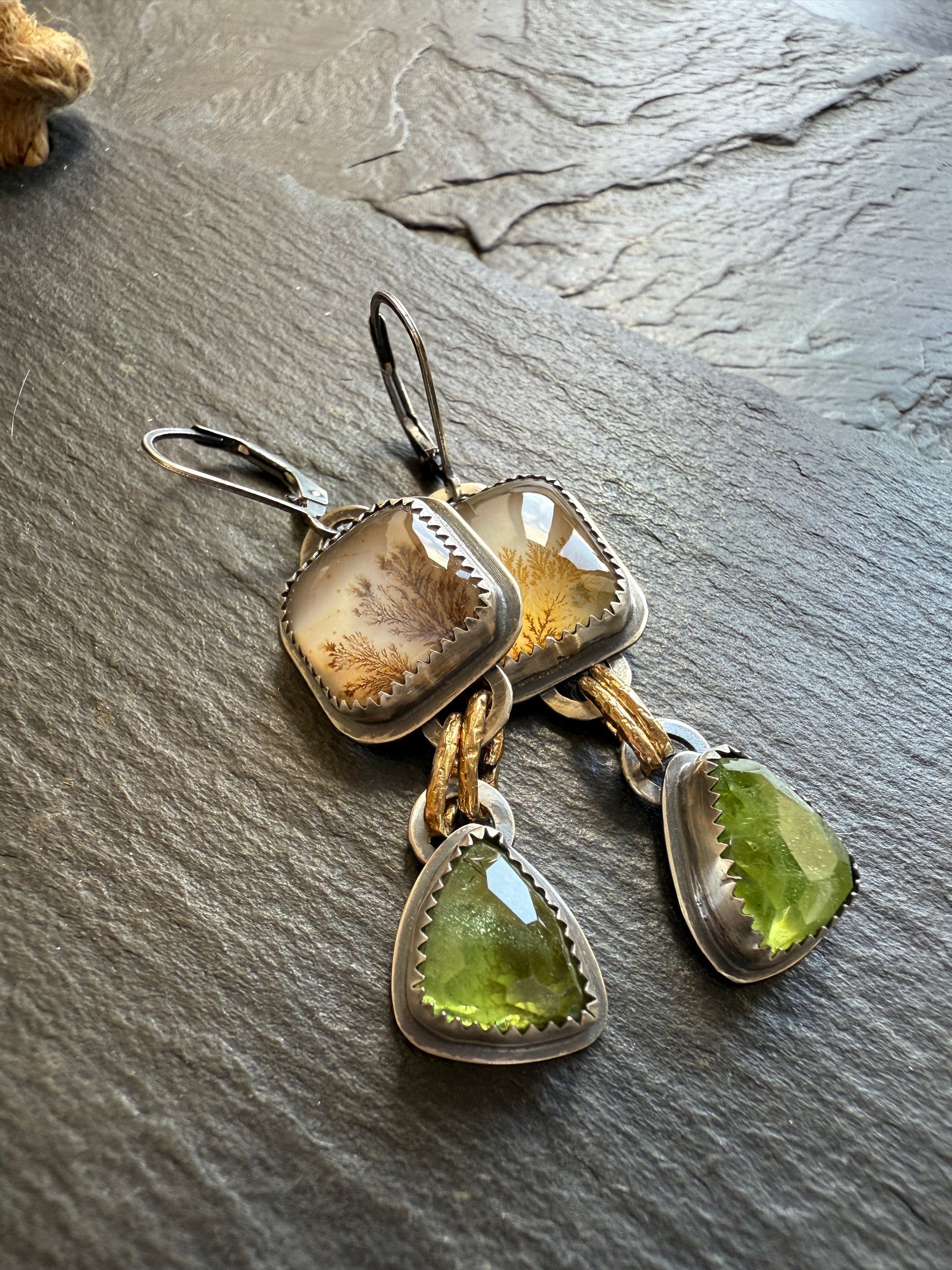 Featuring a pair of mismatched earrings. I have bezel set two dentric agates and peridot gemstones in fine and sterling silver. Drop is 56mm approximately. The pendants have been oxidised and polished to a rustic patina and hang from gold bronze links and a pair of sterling silver lever back ear wires.