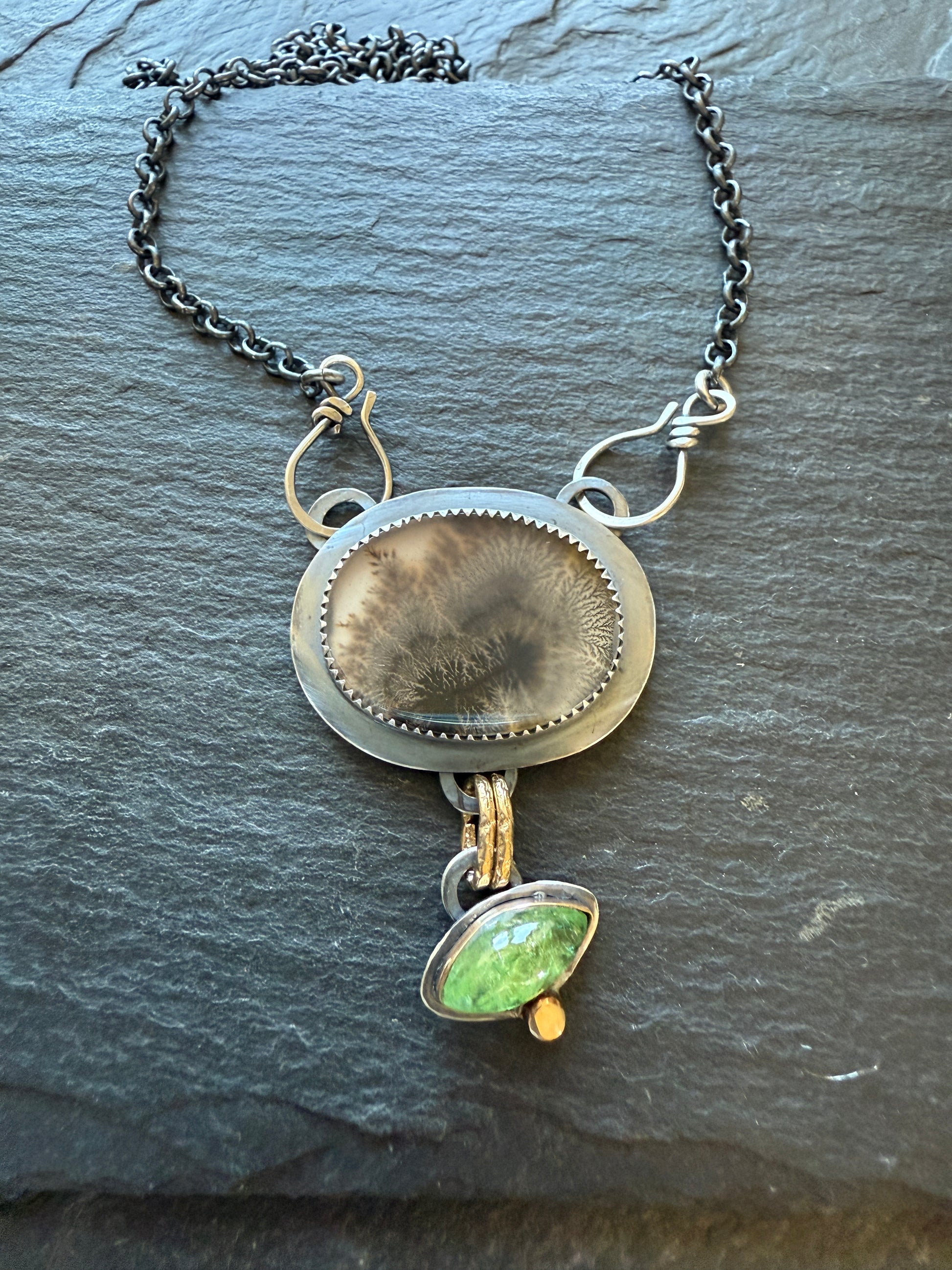 Featuring a gorgeous scenic agate with lots of mossy ferns combined with a beautiful tsavorite green garnet.