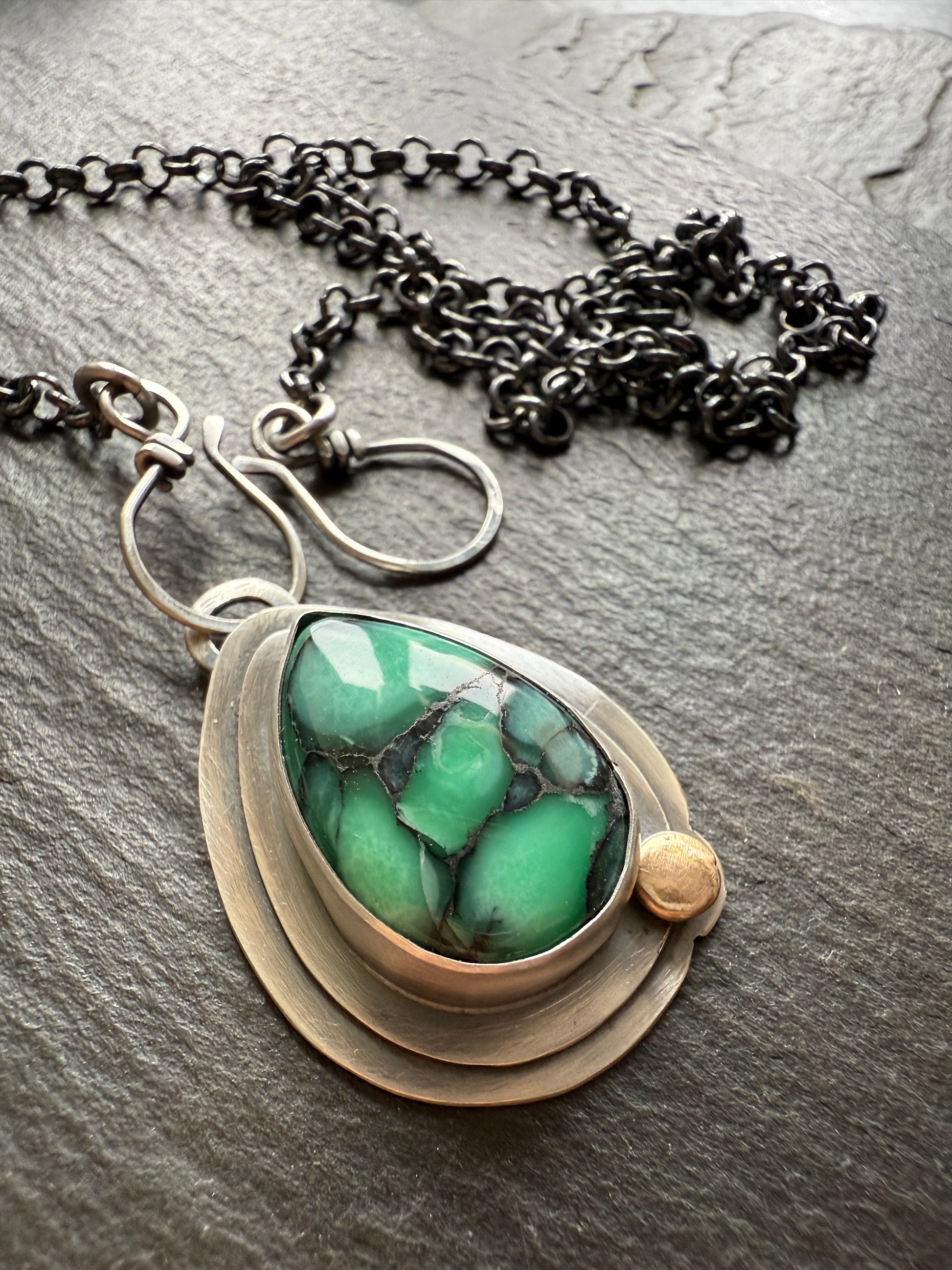 Featuring a beautiful Desert Oasis Variscite stone set in fine and sterling silver with an 18k gold accent and a gold bronze link. The pendant hangs from a dark oxidised 18” chain. The pendant measures 31mm x 24mm. The stone measures 20mm x 14mm approximately.