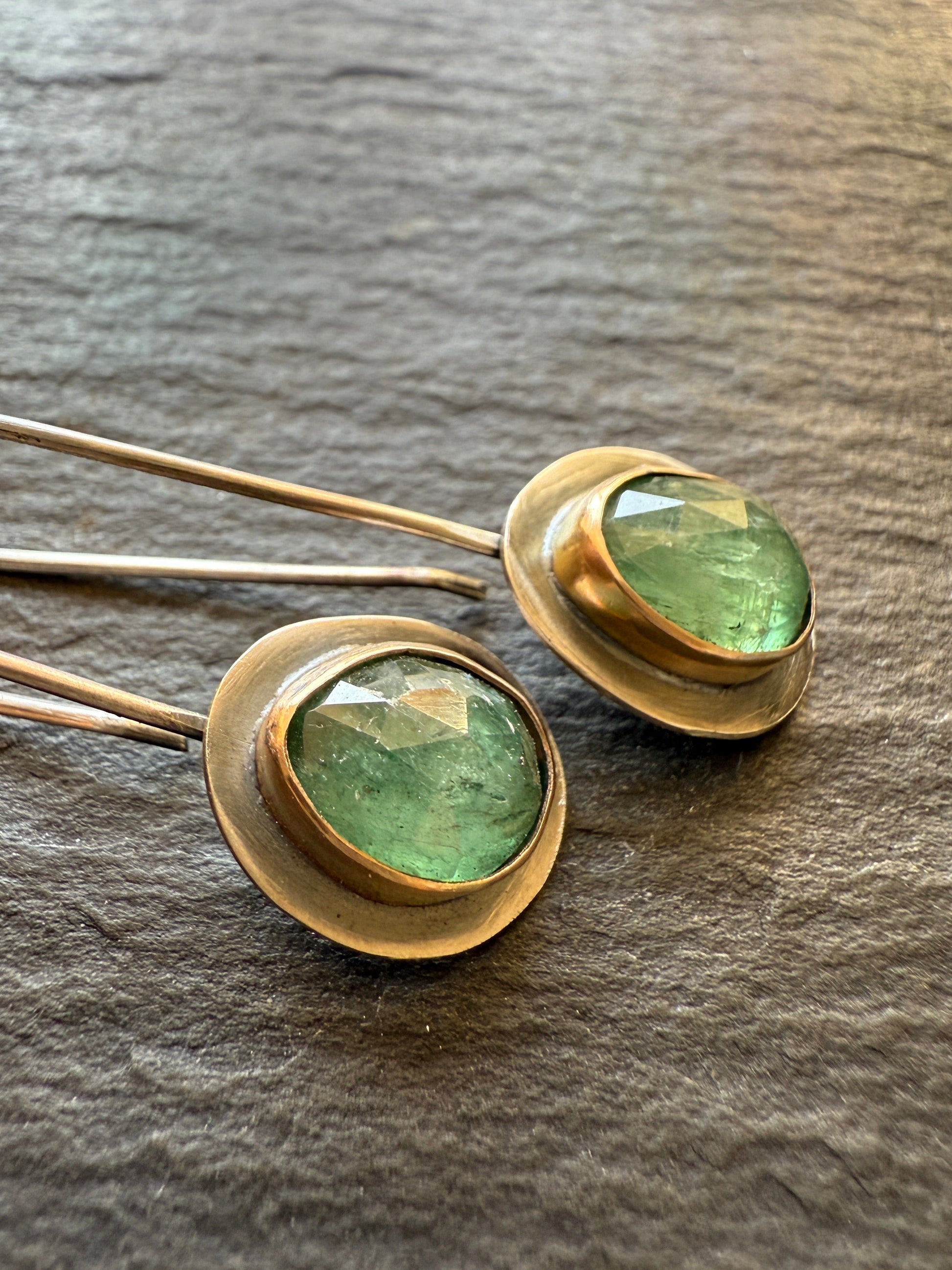 Featuring a pair of drop dangle earrings with emerald green kyanite stones set in 14k gold fill and sterling silver. The earrings hand down at 40mm. Lightweight everyday wear.