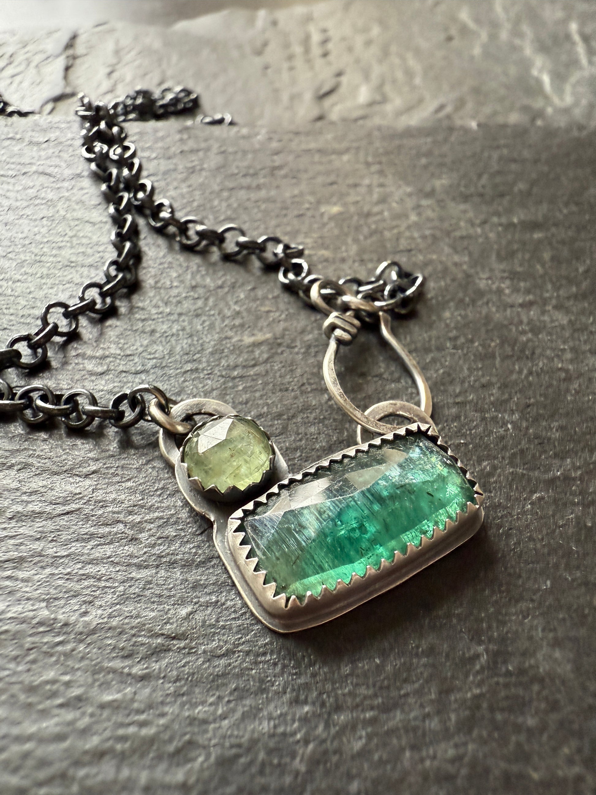 Gorgeous emerald and light green kyanite gemstones, bezel set in oxidised sterling silver. The pendant hangs from a 15.5” oxidised chain with a hand forged sterling hook making it a front fastening necklace.