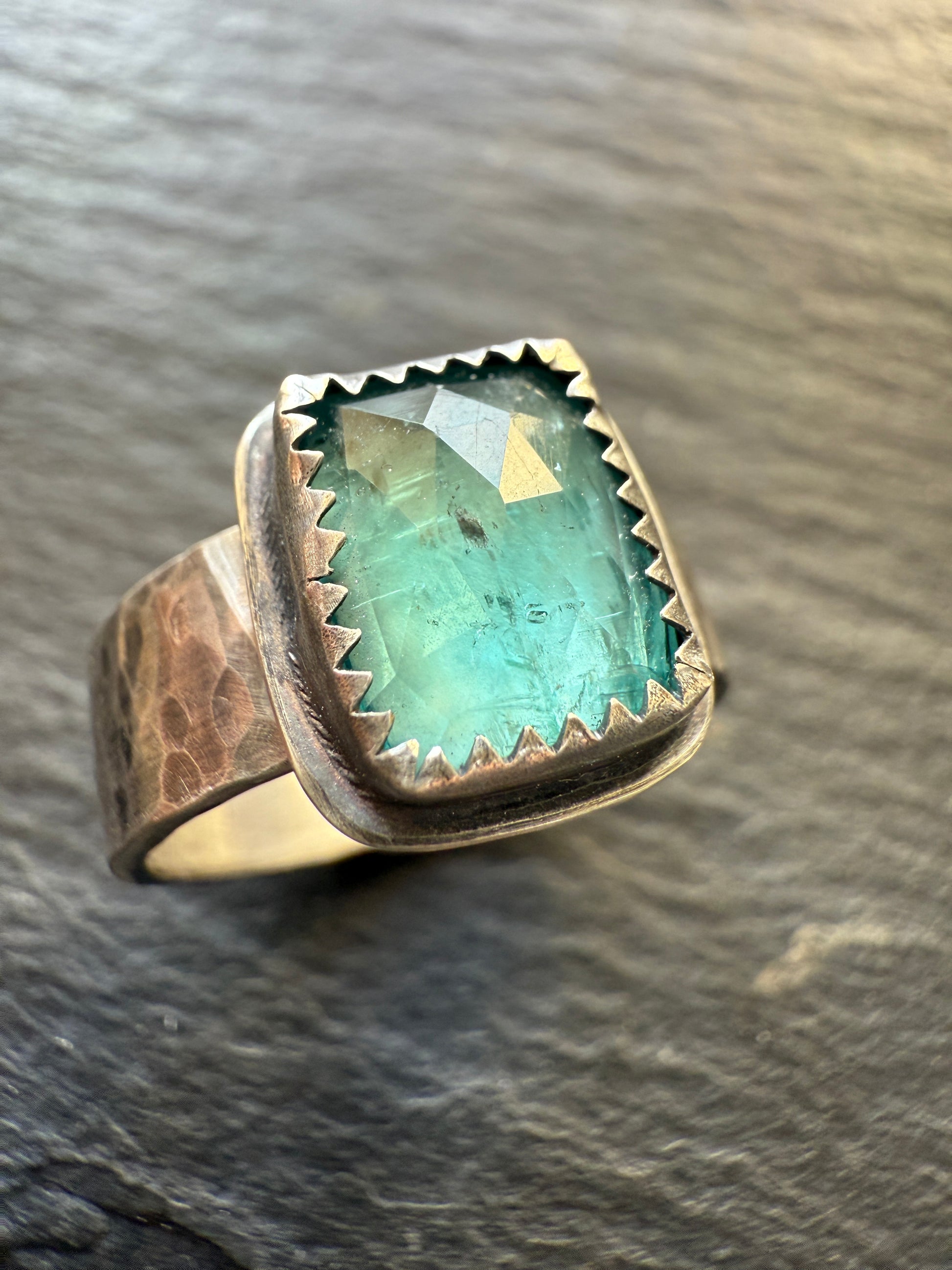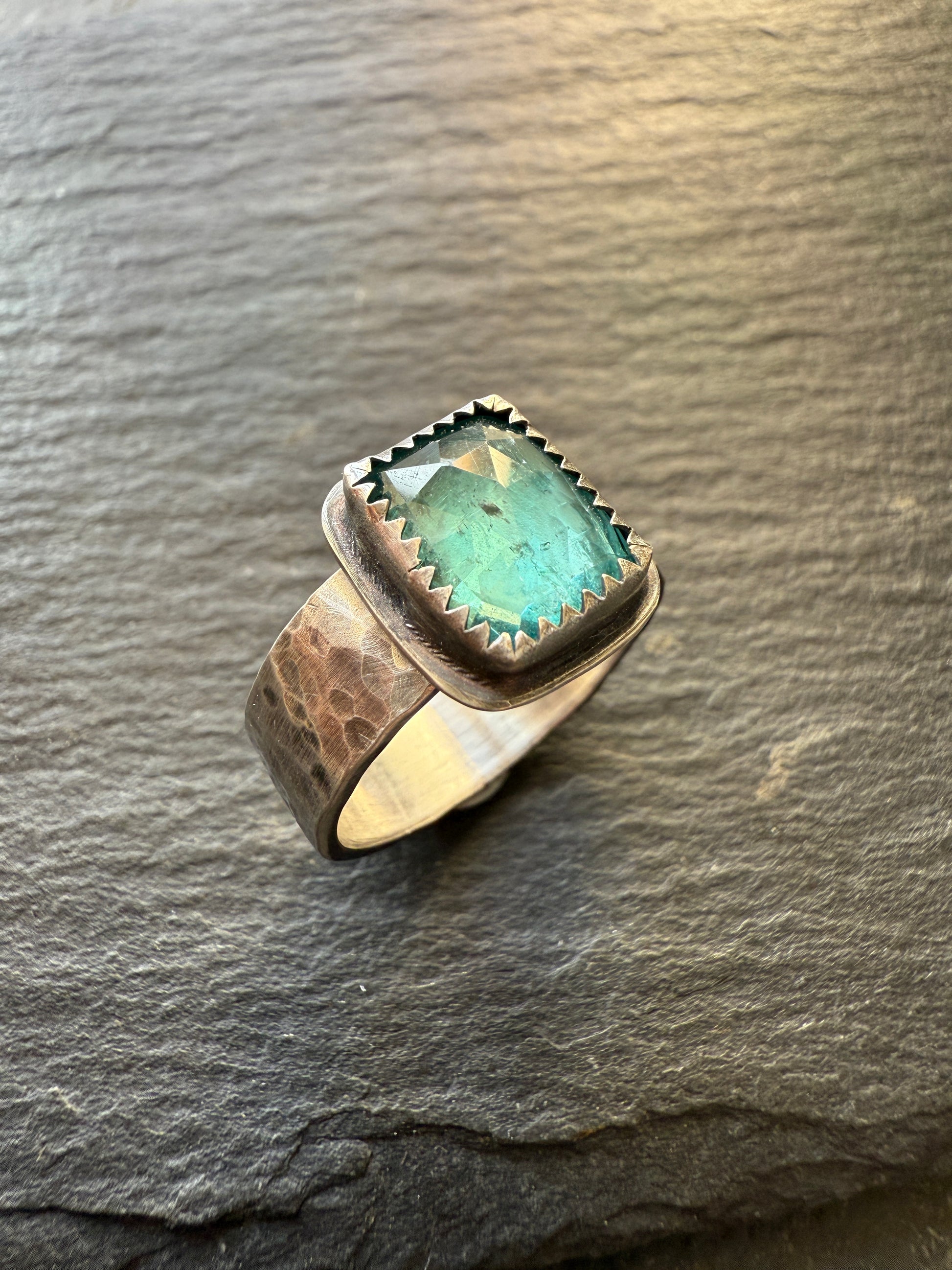 Featuring a gorgeous emerald kyanite ring. This beautiful stone sits atop a hammered sterling band. To fit a 7.5 (UK O 1/2).