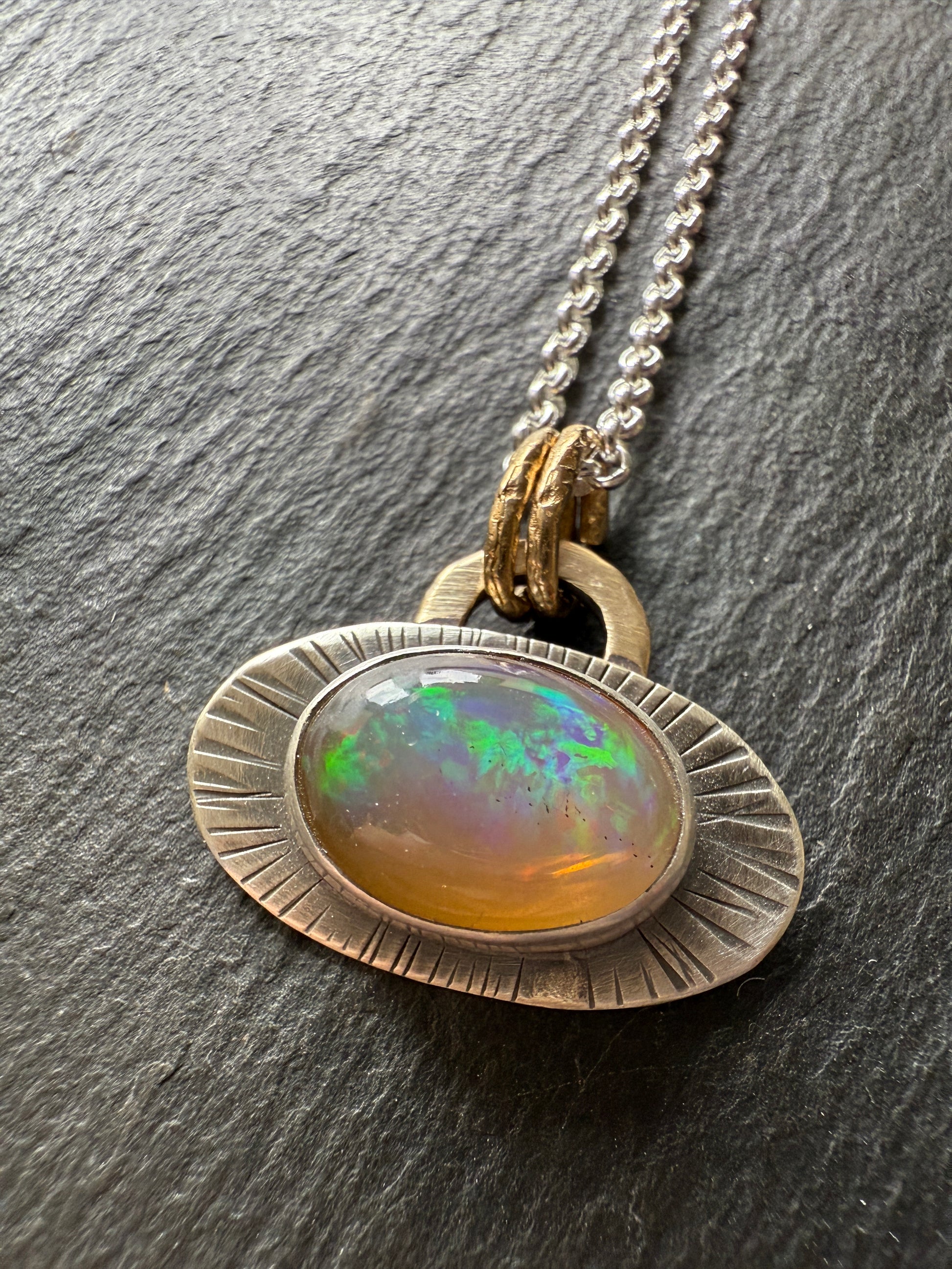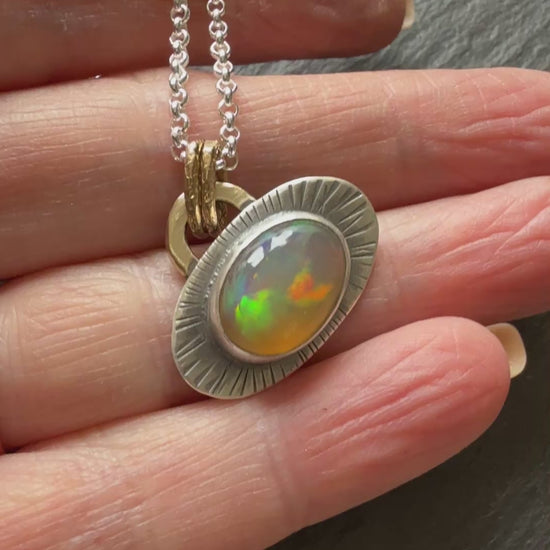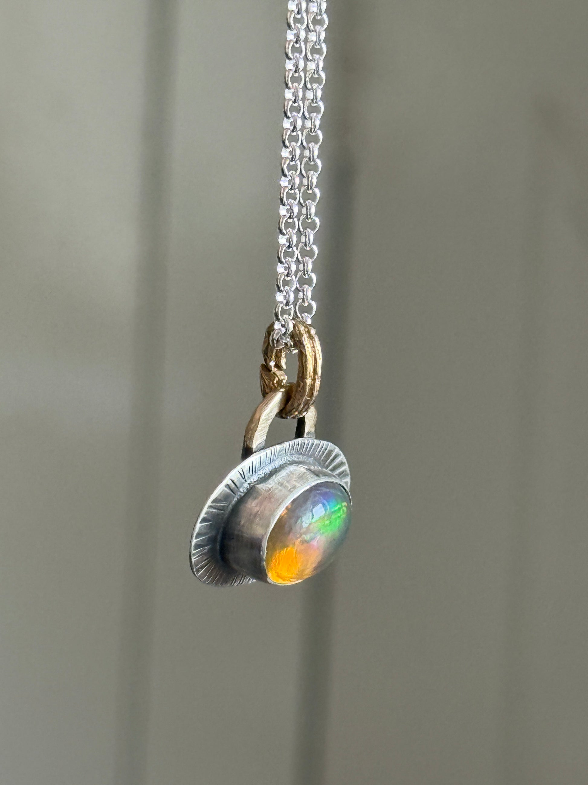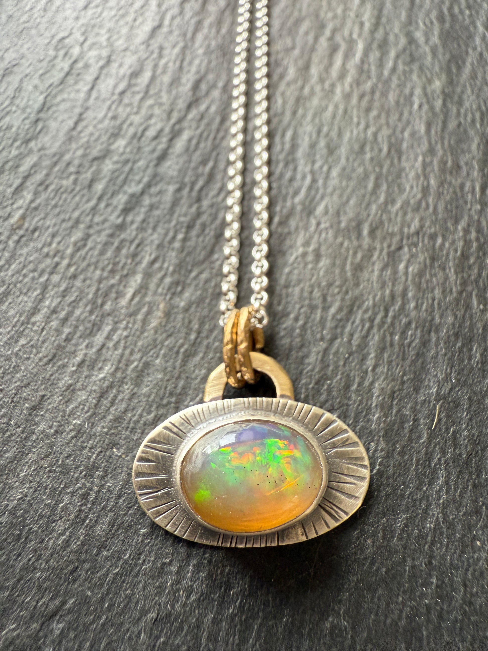 Featuring a brilliant fire Ethiopian Opal. This beauty is set in fine and sterling silver with a gold bronze link. The chain is a shiny 18” sterling silver. The opal measures 11mm x 8mm (excluding the setting).