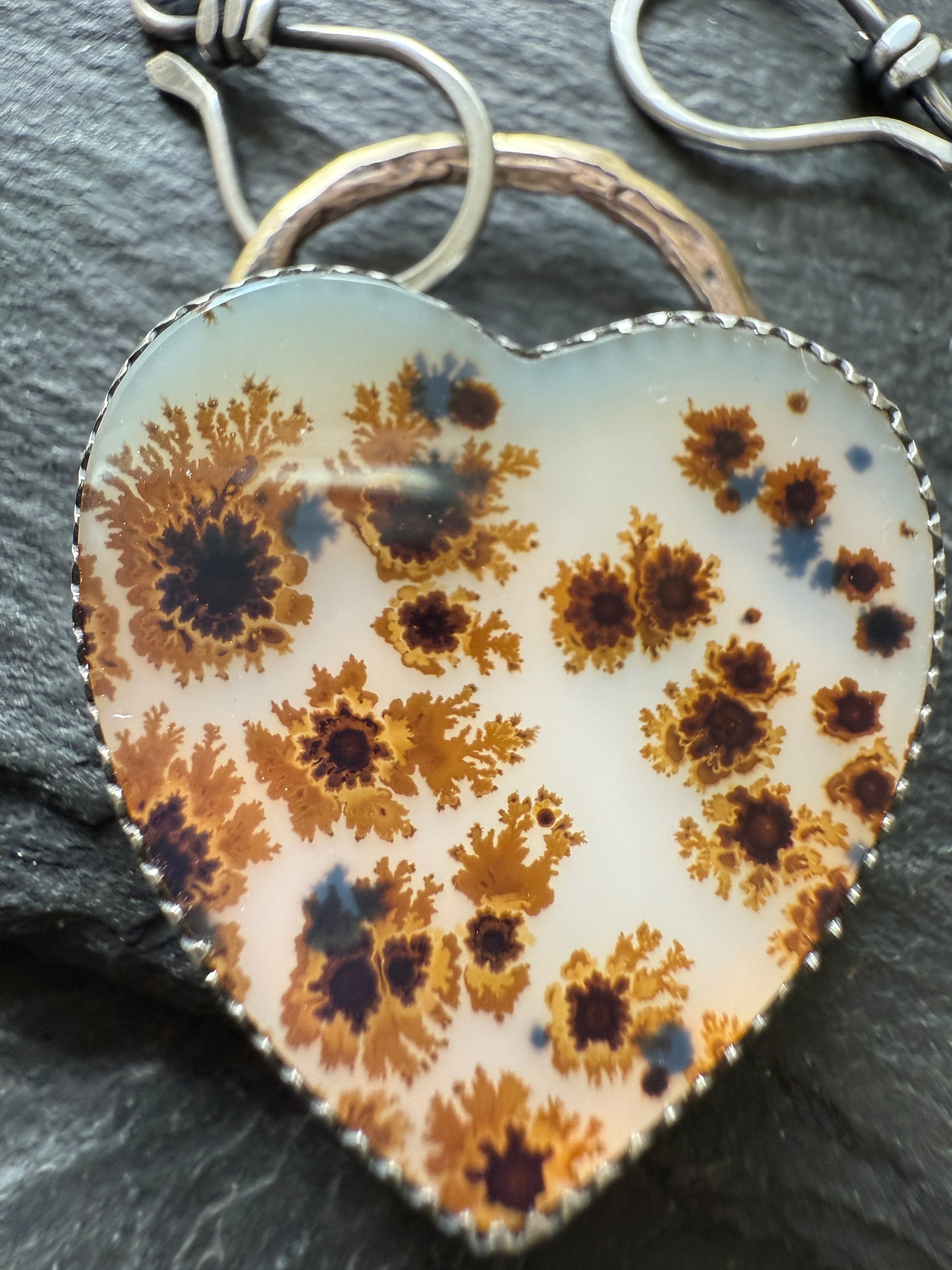 Featuring a gorgeous, scenic dentritic agate heart pendant 22mm x 24mm. This beauty is set in fine silver and sterling silver. The pendant hangs from a 19” dark oxidised chain with hand forged hooks.
